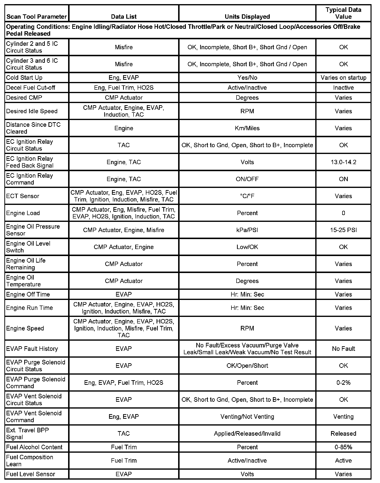 The column labeled Data List indicates where a parameter can be located on the scan tool. Refer to the scan tool operating data for the exact locations of the data lists. The following is a description of each term listed: