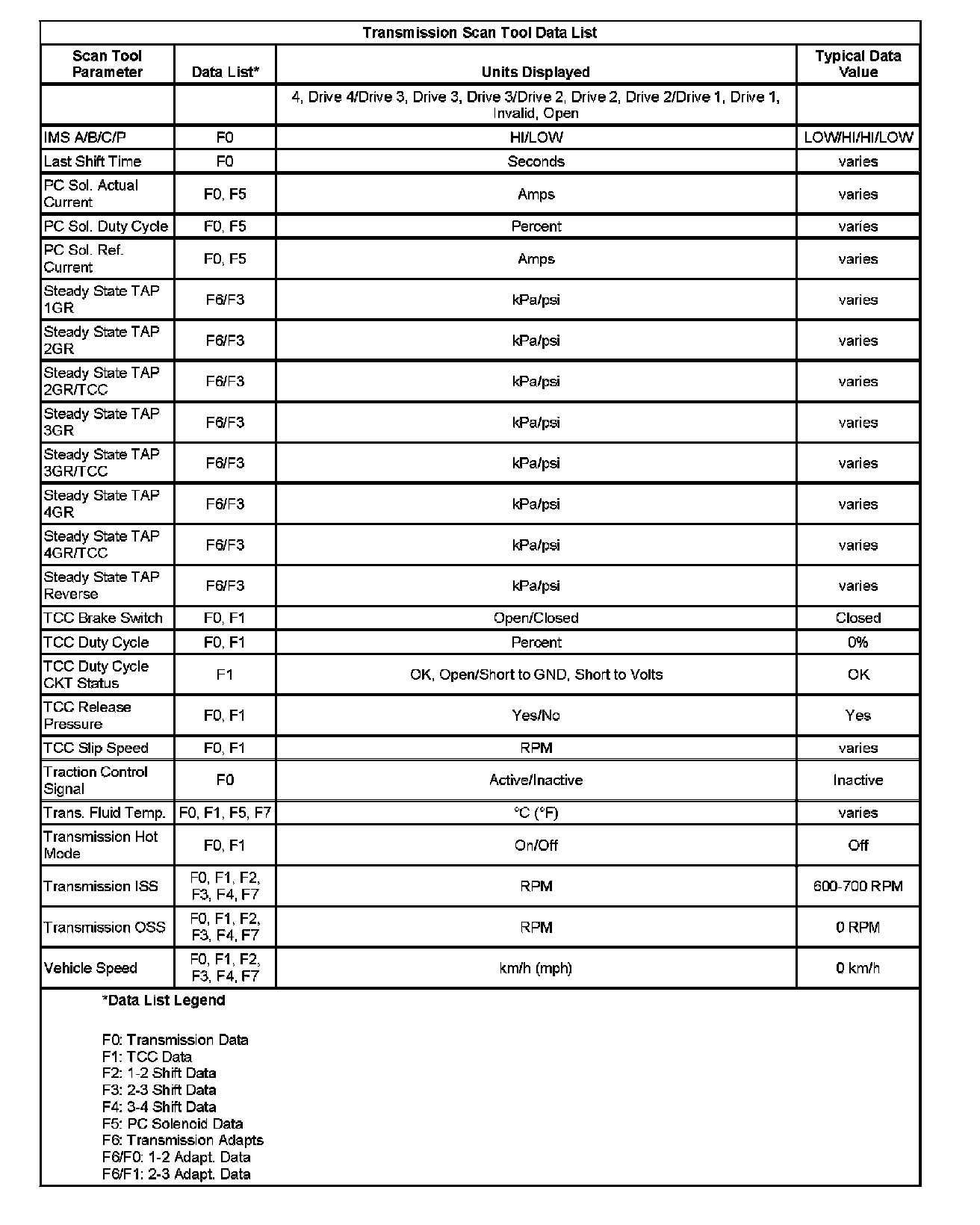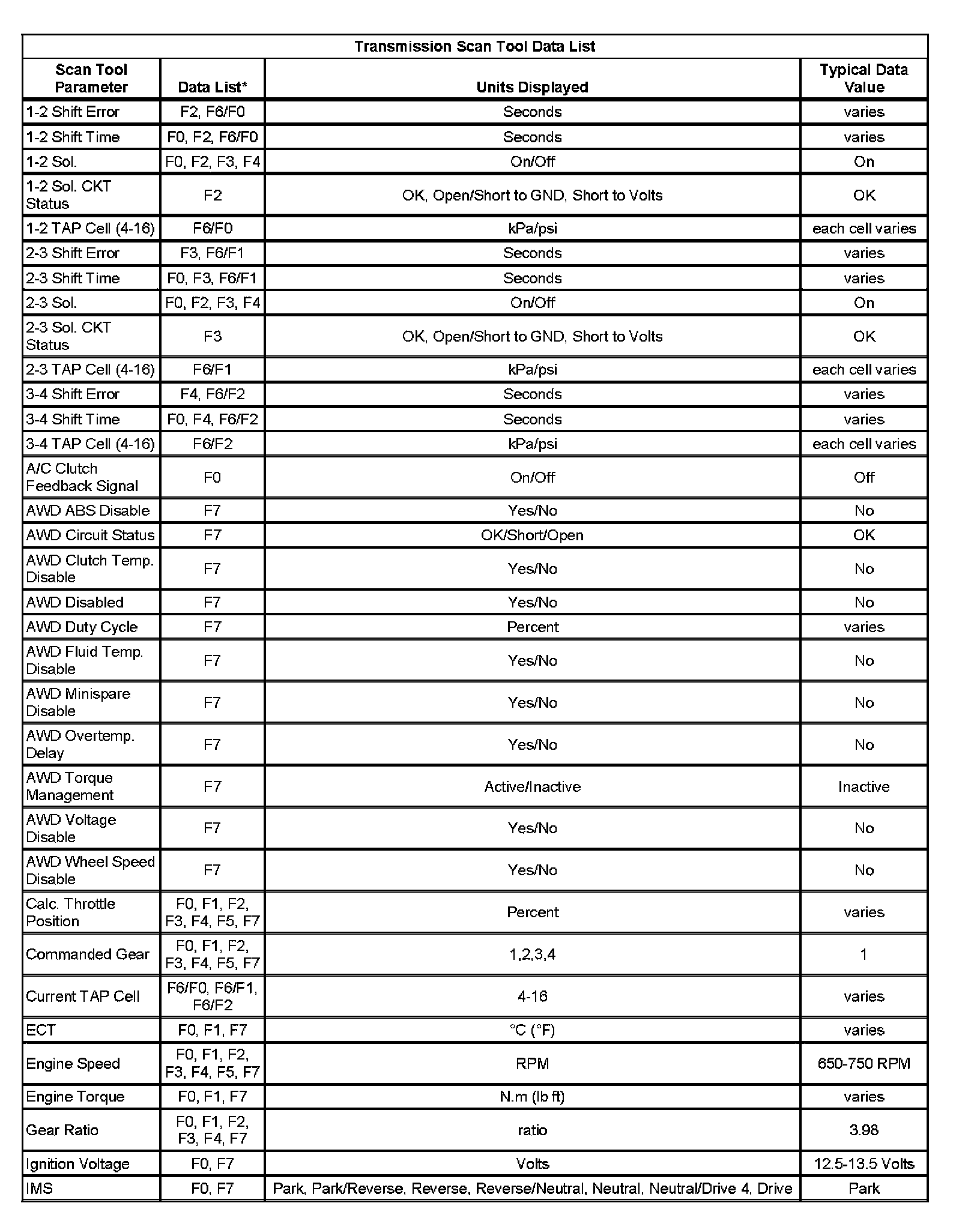 Only the parameters listed below are used in this manual for diagnosing. If a scan tool displays other parameters, the values are not recommended by General Motors for use in diagnosis.