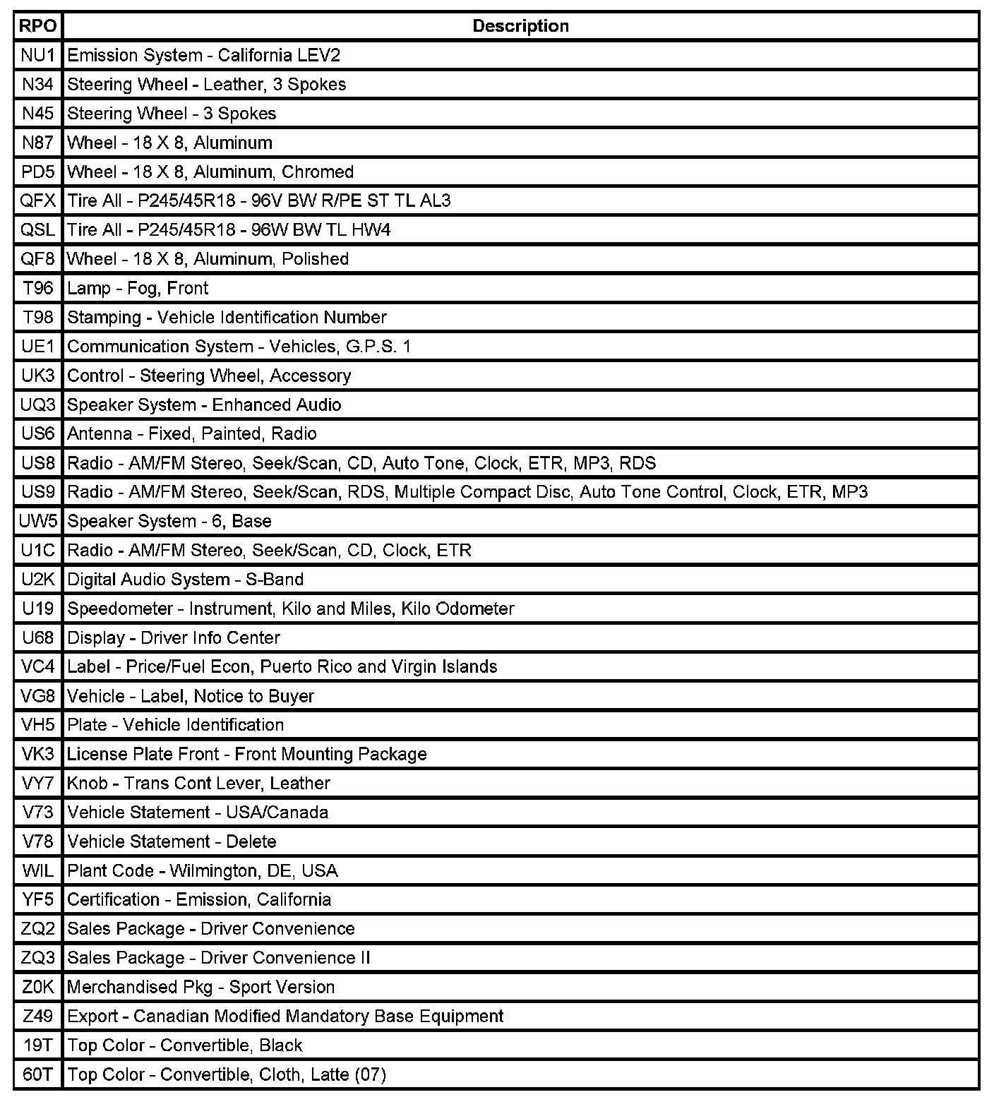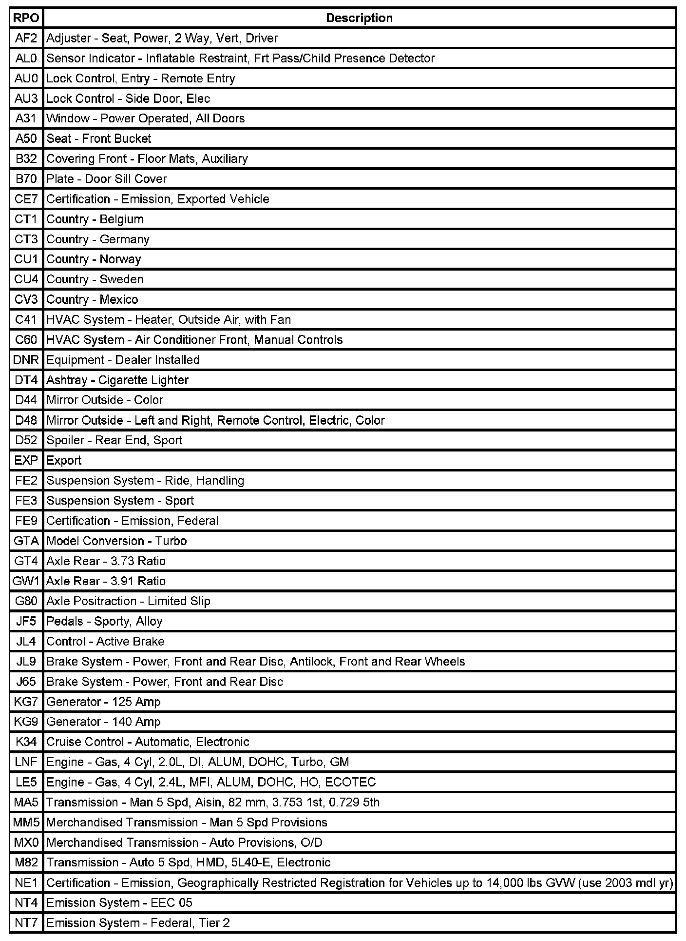 The following table provides the description of the Regular Production Option (RPO) codes that are available on the vehicle. The vehicle RPO list is printed on the Service Parts Identification Label.