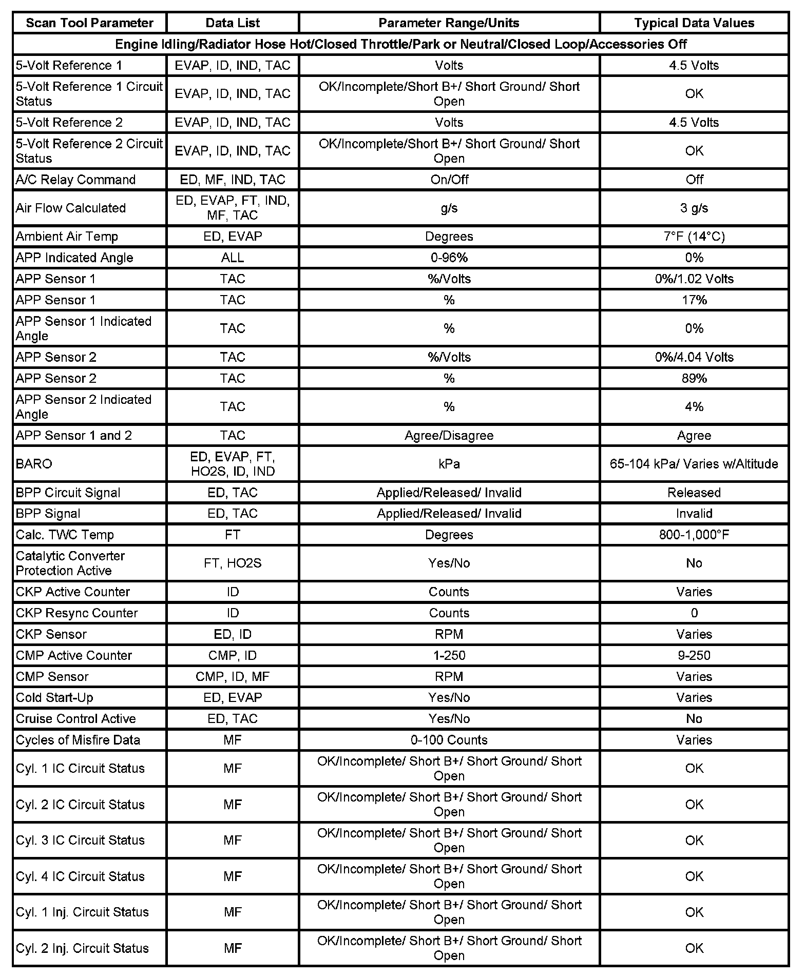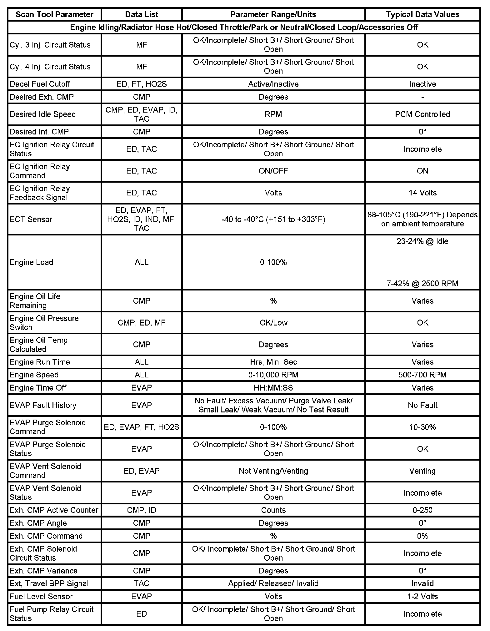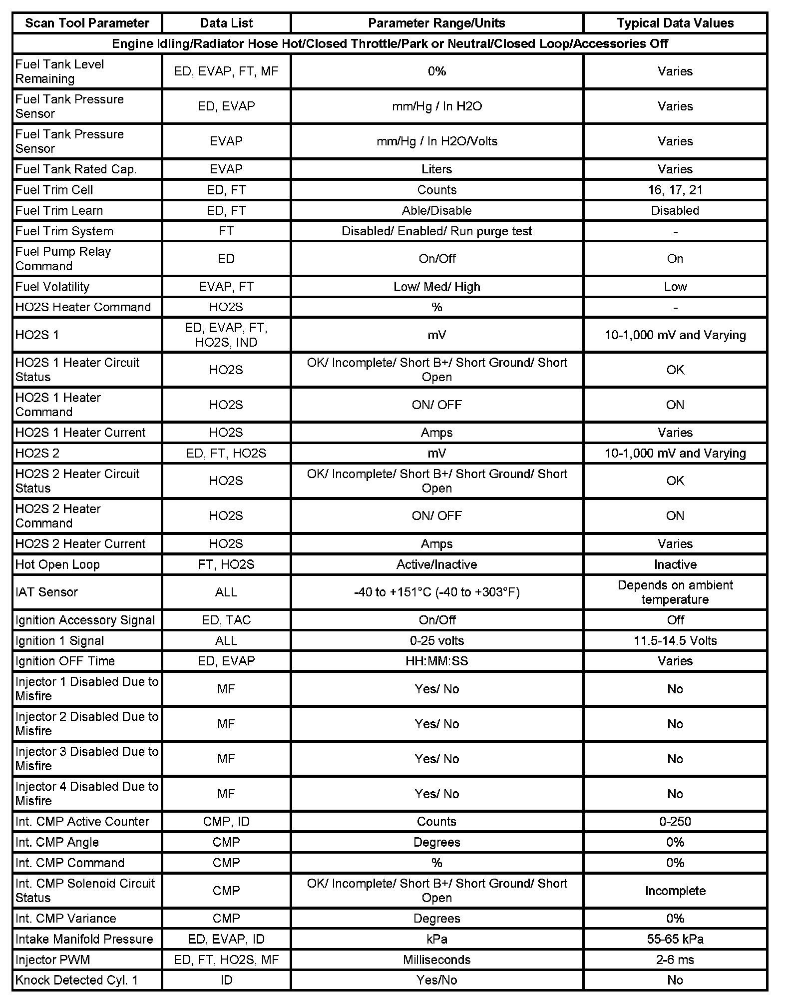 The Engine Scan Tool Data List contains all engine related parameters that are available on the scan tool. The list is arranged in alphabetical order. A given parameter may appear in any one of the data lists, and in some cases may appear more than once, or in more than one data list in order to group certain related parameters together.