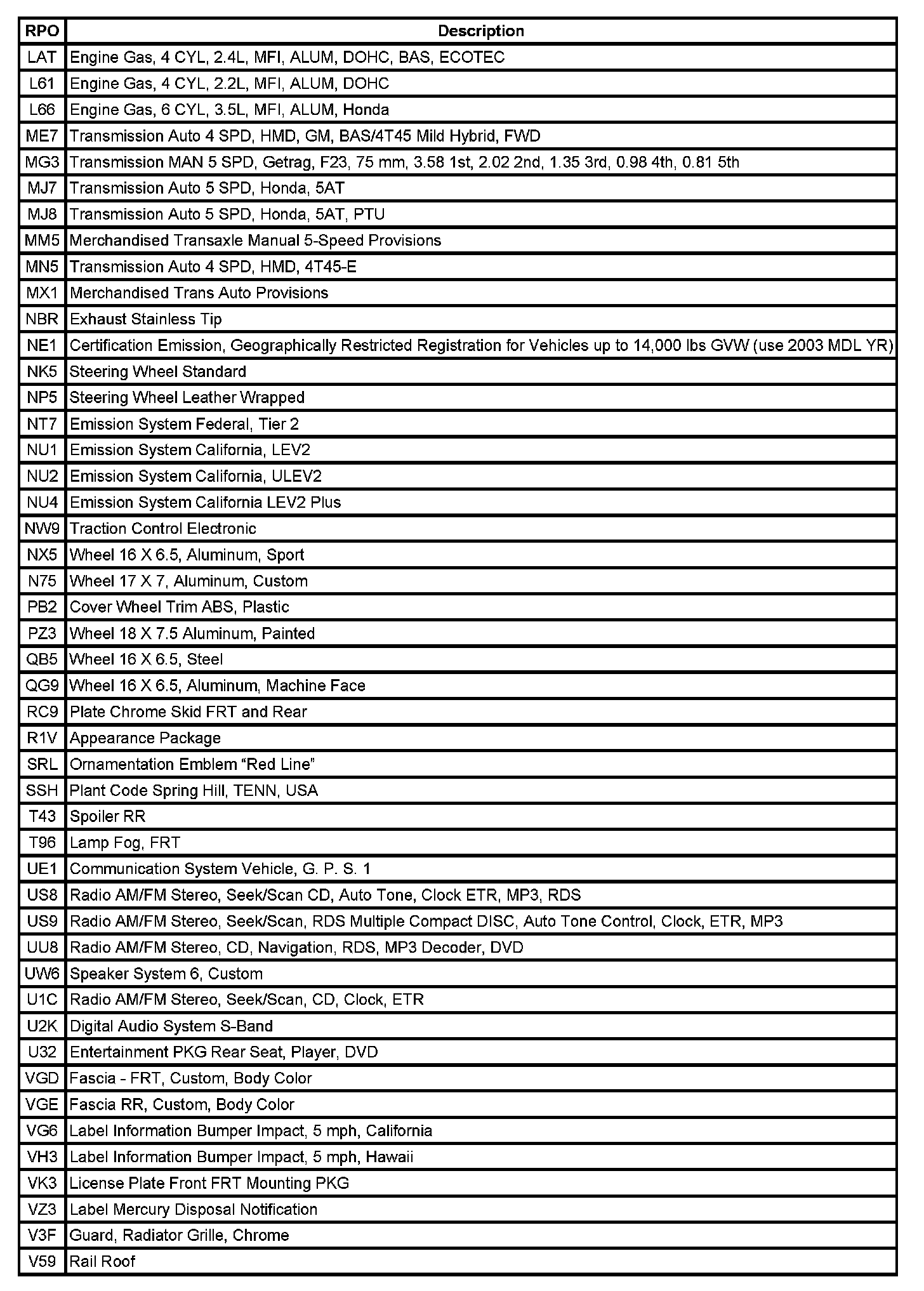 The following table provides the description of the RPO codes that are available on the vehicle. The vehicles RPO list is printed on the Service Parts Identification Label.
