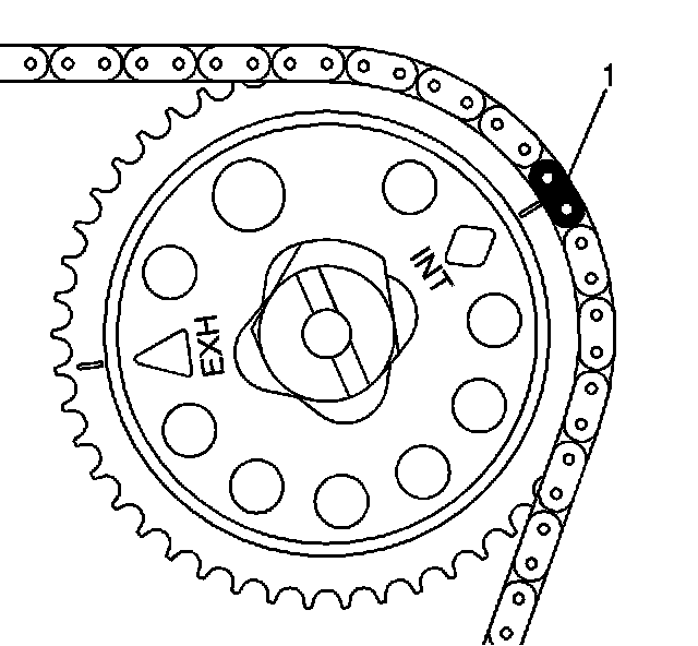 Assemble the intake camshaft sprocket to the timing chain with the timing mark lined up with the uniquely colored link (1). Hand tighten a new intake camshaft sprocket bolt.