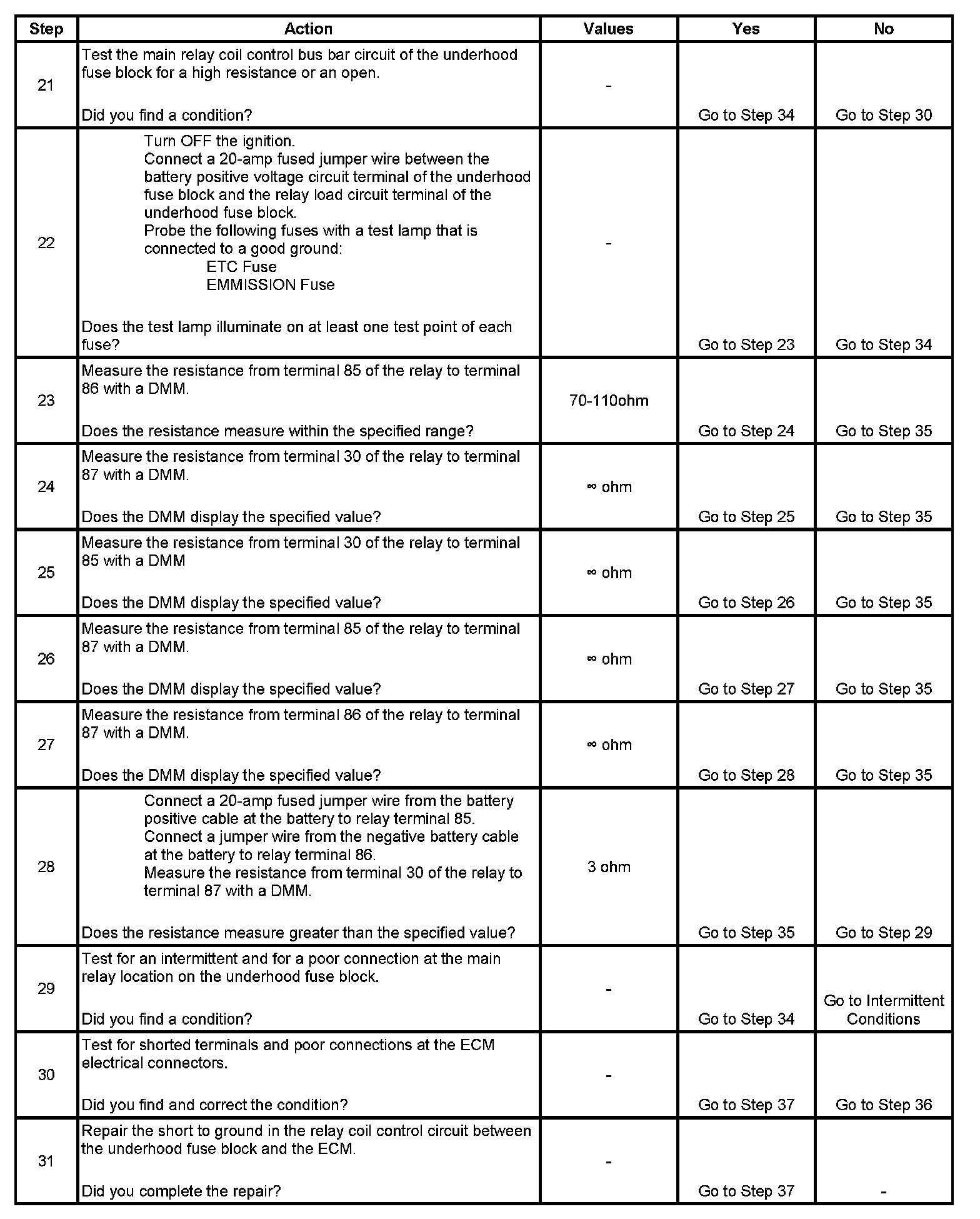 The main relay system diagnosis table assumes that the vehicle battery is fully charged. Refer to Battery Inspection/Test (Side Terminal Battery) Battery Inspection/Test (Top Post Terminal Battery).