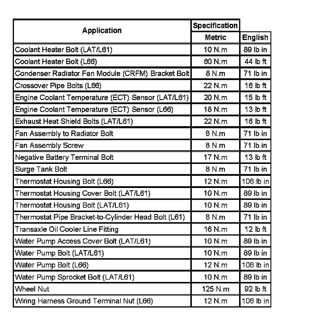 Fastener Tightening Specifications: