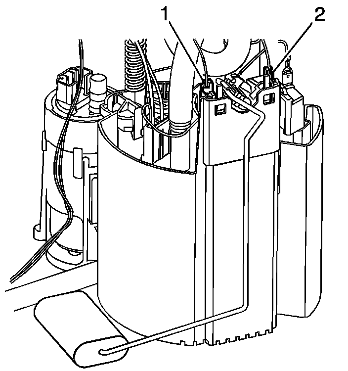 1. Install the fuel level sender unit and float onto the fuel pump module. Make sure that the sender cap snaps into place (1, 2).