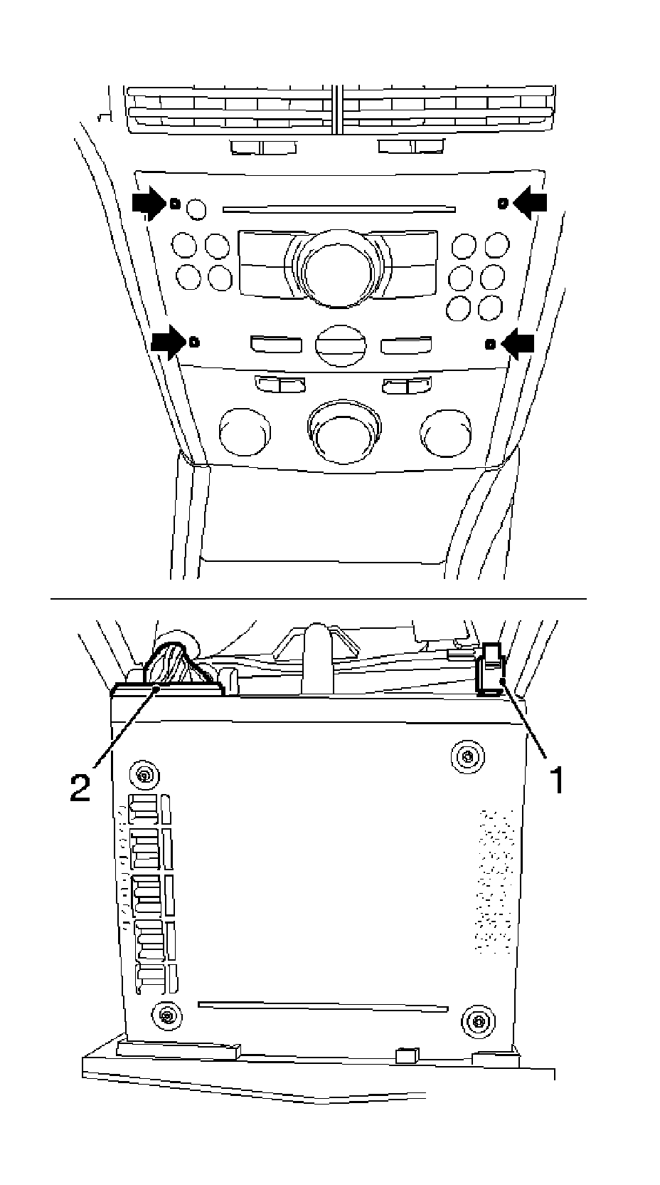 2. Push the removal bracket into the openings (arrows) until it engages, press outwards and withdraw radio.