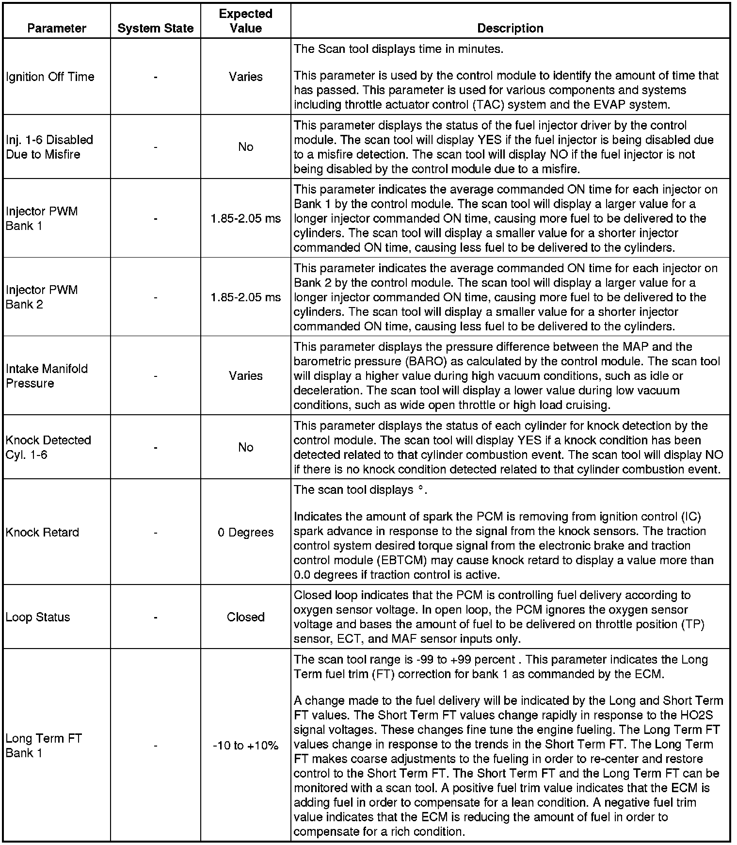 The scan tool values from a properly running engine may be used for comparison with the engine you are diagnosing. The Engine Scan Tool Data List represents values that would be seen on a normally running engine.