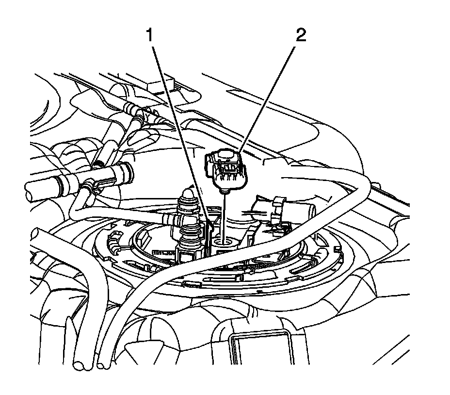 1. Install the fuel tank pressure sensor (2) to the fuel pump module assembly until the sensor engages the retaining tab (1).