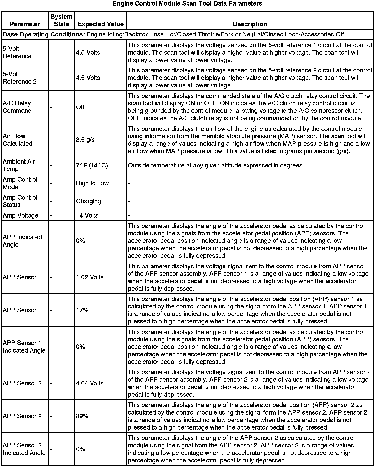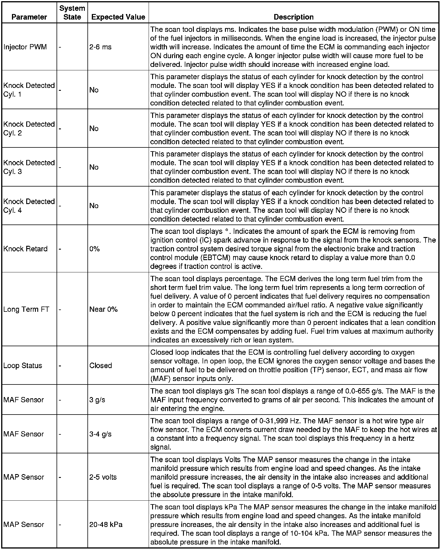 Scan tool values from a properly running engine may be used for comparison with the engine you are diagnosing. The Engine Scan Tool Data List represents values that would be seen on a normal running engine.