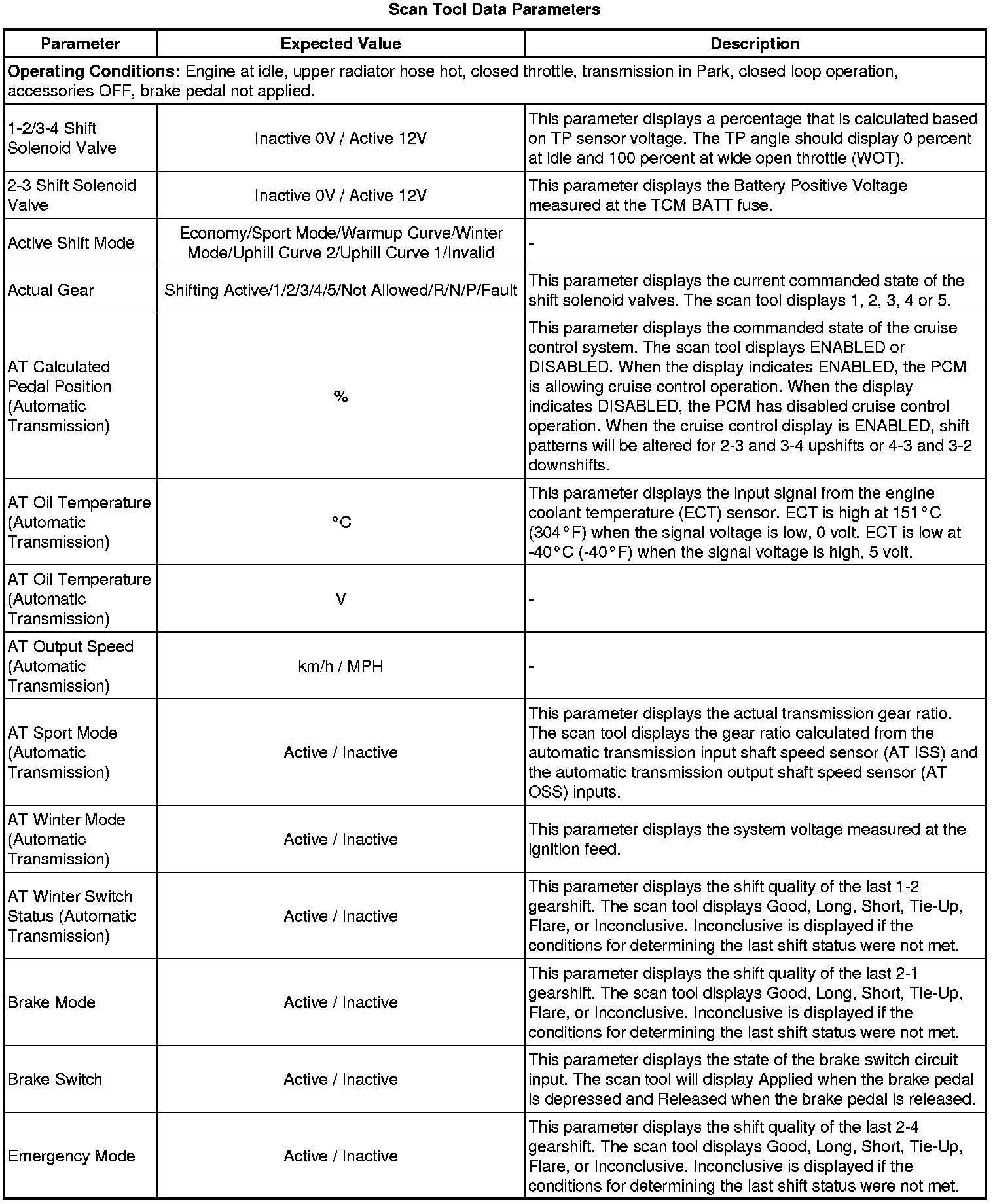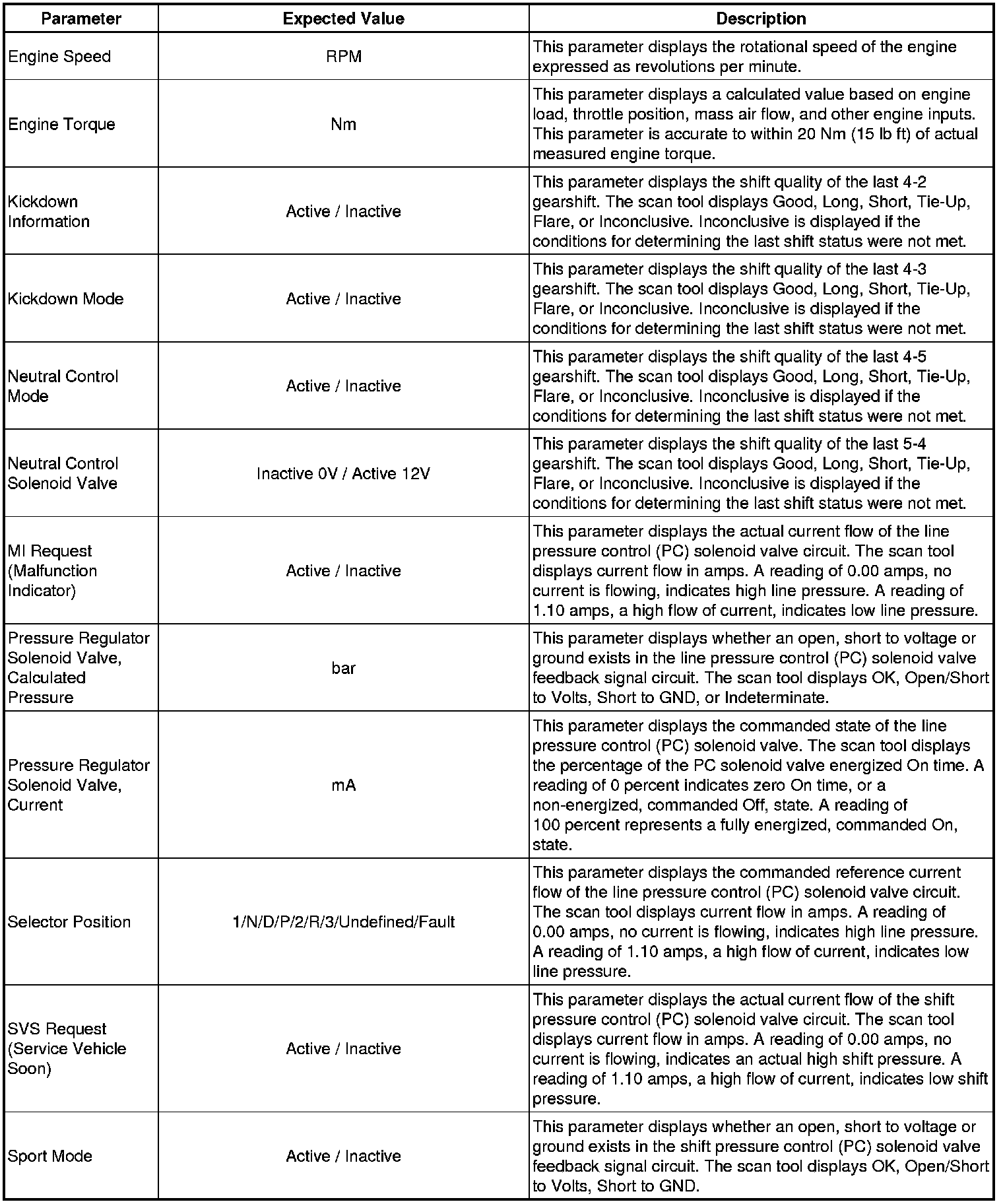 The scan tool values from a properly functioning transmission may be used for comparison with the transmission you are diagnosing. The values below represent a typical display recorded from a properly functioning system.