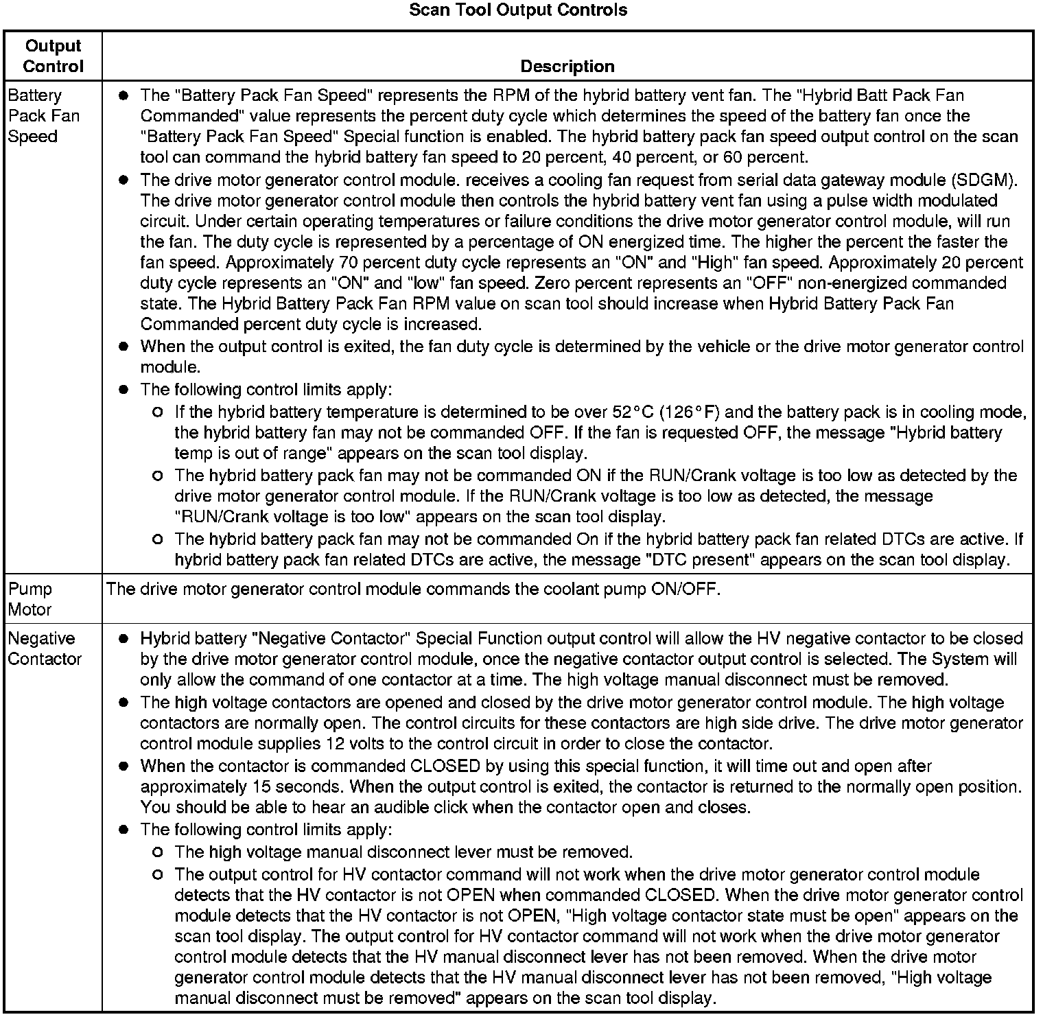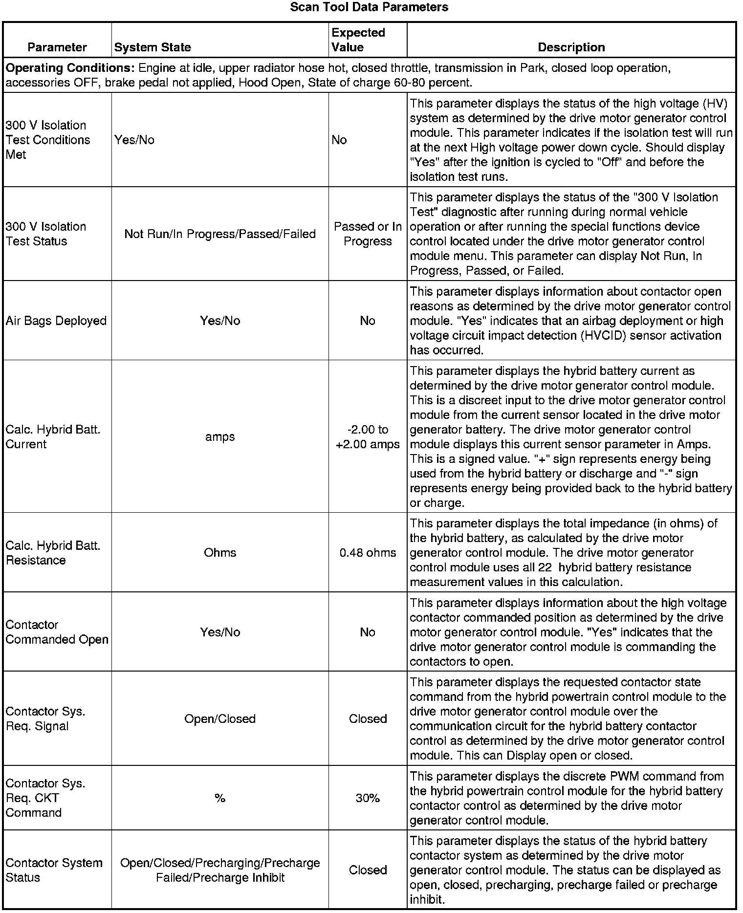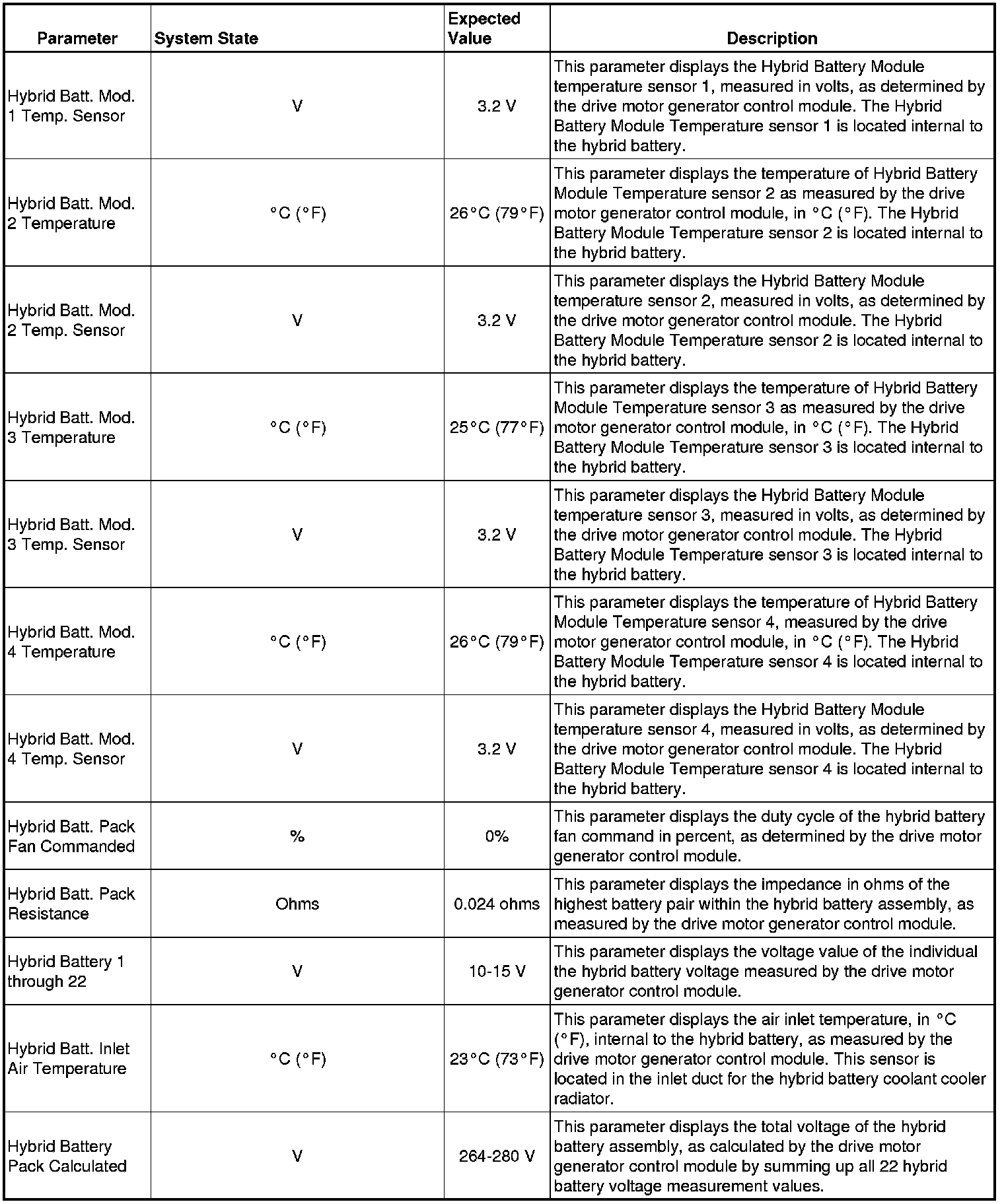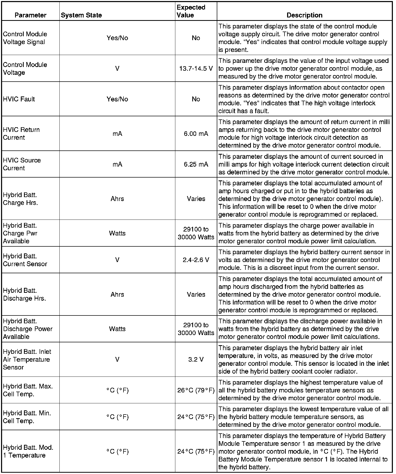 The Drive Motor Generator Battery Control Module Scan Tool Data List contains all Hybrid Battery related parameters that are available on the scan tool. The list is arranged in alphabetical order. A given parameter may appear in any one of the data lists, and in some cases may appear more than once, or in more than one data list in order to group certain related parameters together.