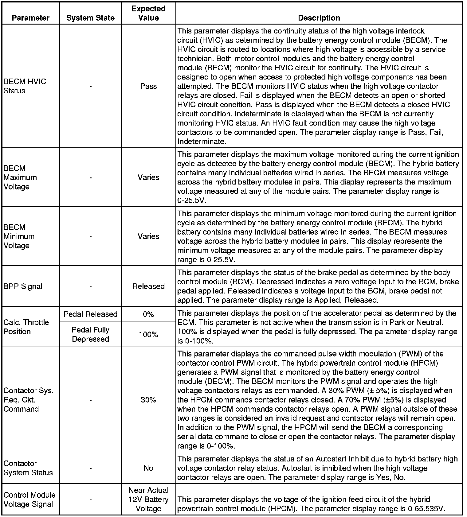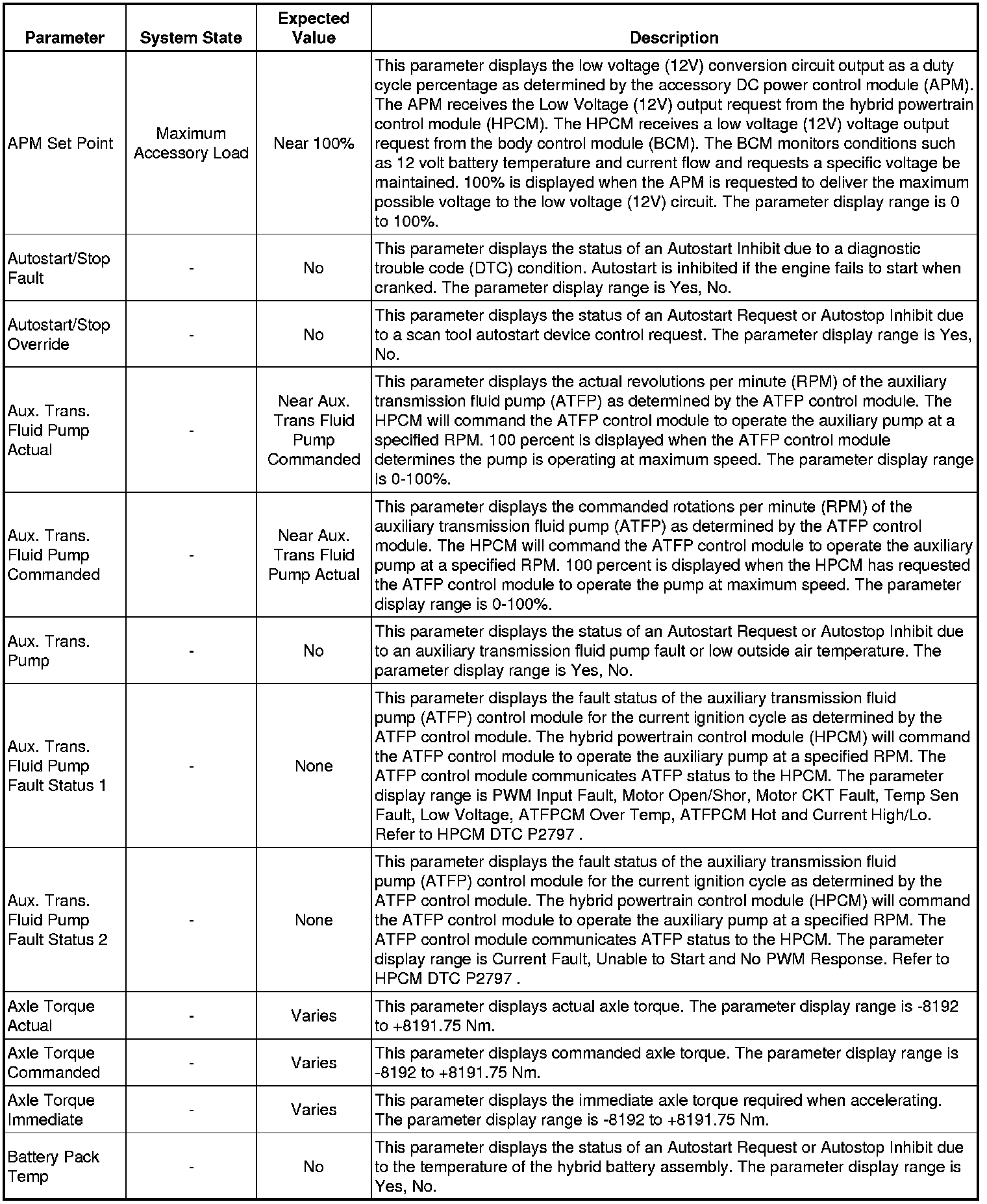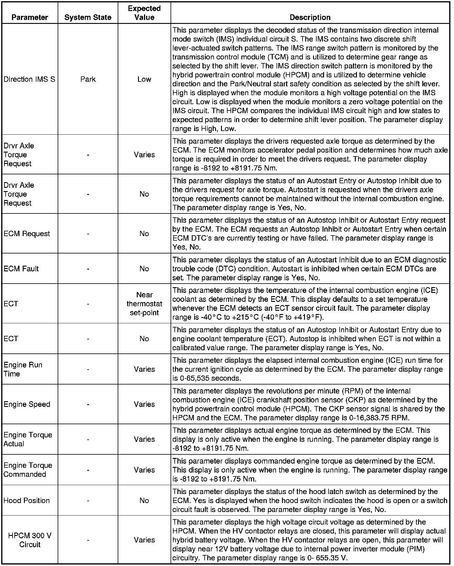 The scan tool values from a properly running vehicle may be used for comparison with the vehicle you are diagnosing. The Hybrid Powertrain Control Module Scan Tool Data Parameters list represents values that would be seen on a normally running vehicle.
