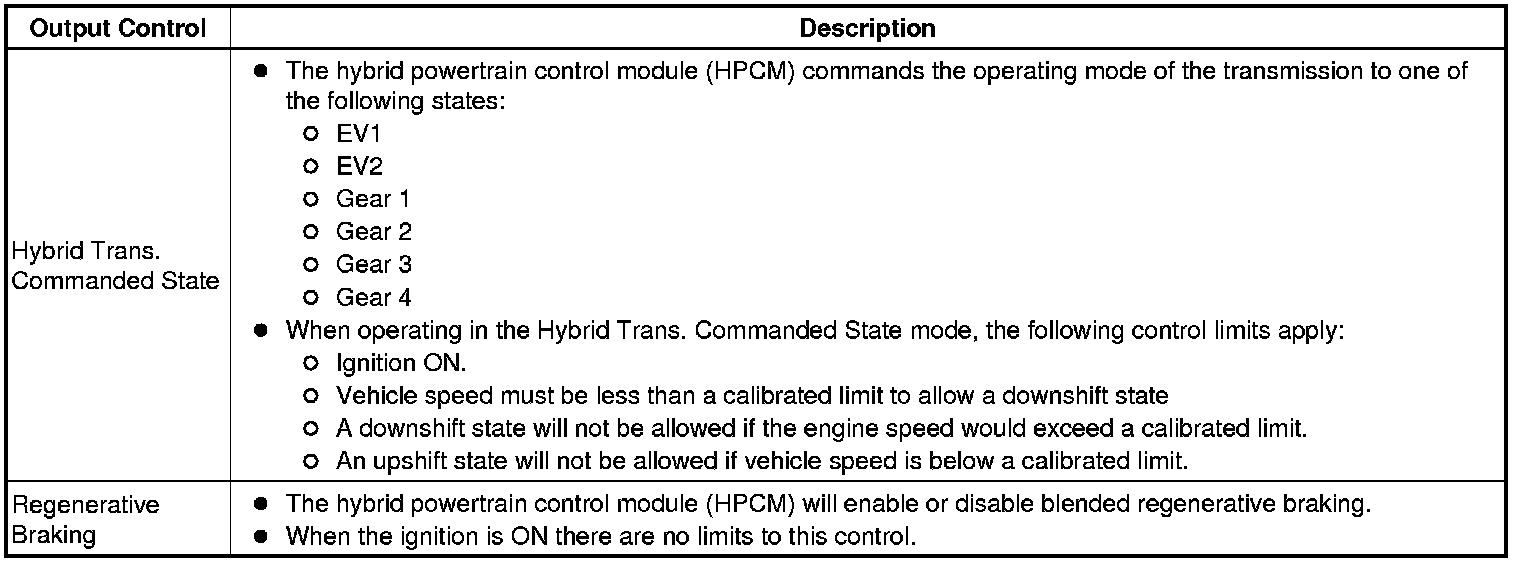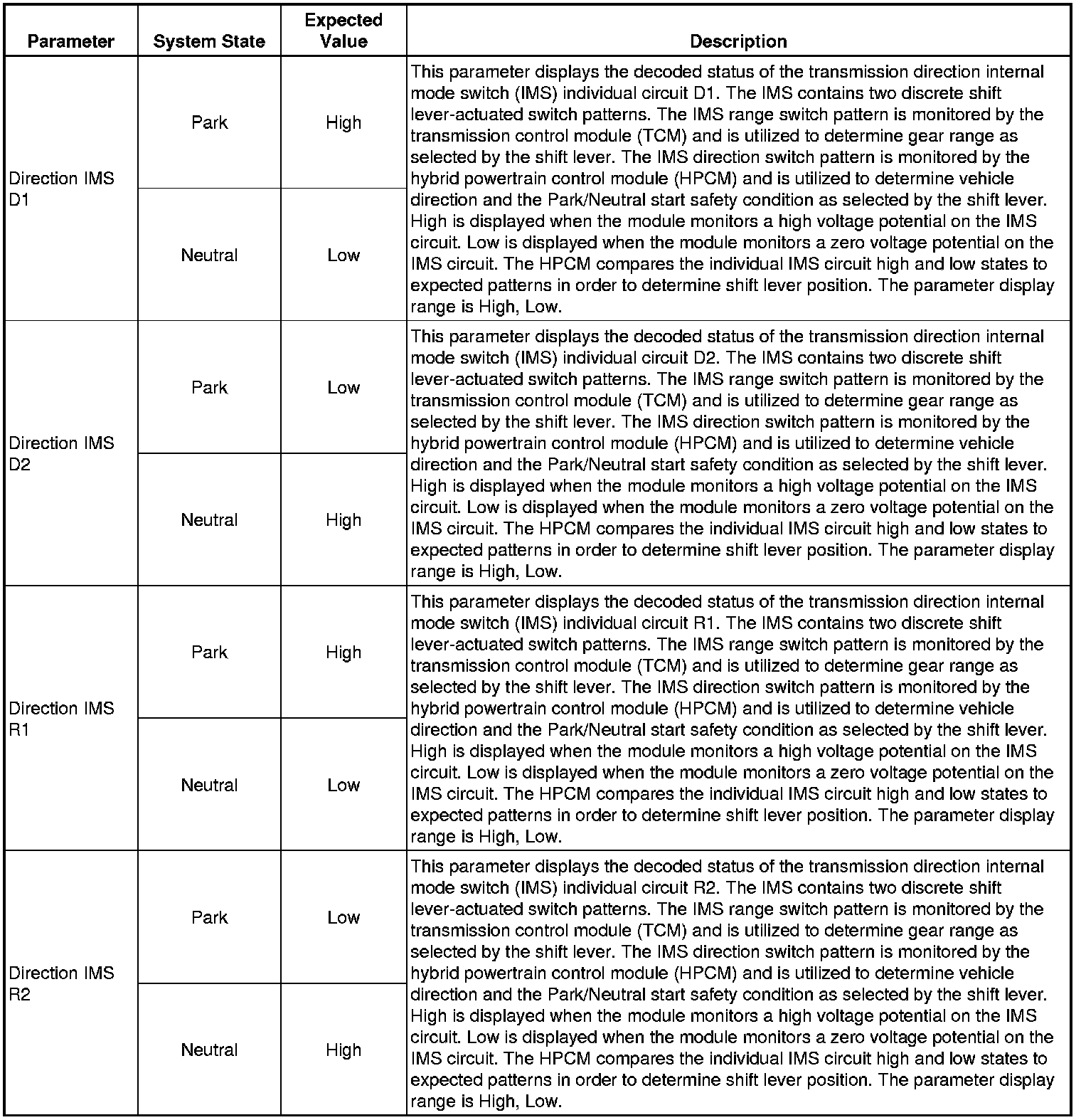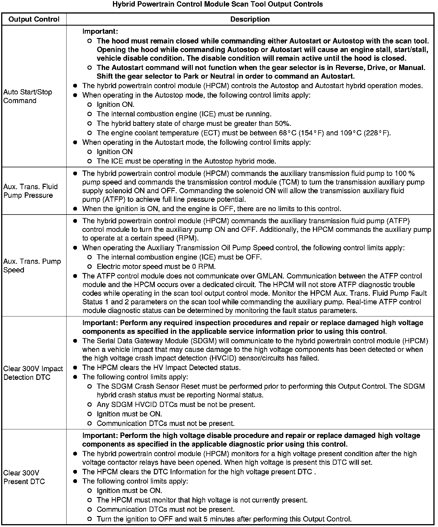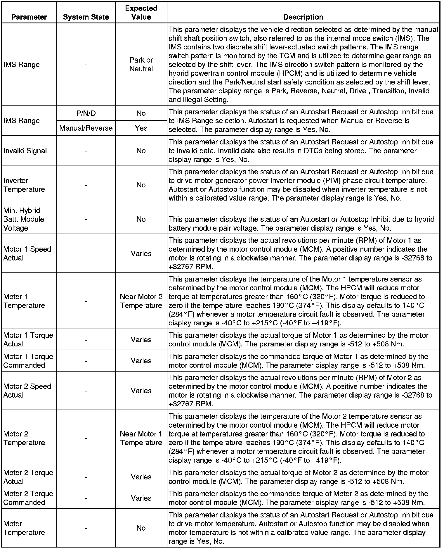 The scan tool values from a properly running vehicle may be used for comparison with the vehicle you are diagnosing. The Hybrid Powertrain Control Module Scan Tool Data Parameters list represents values that would be seen on a normally running vehicle.