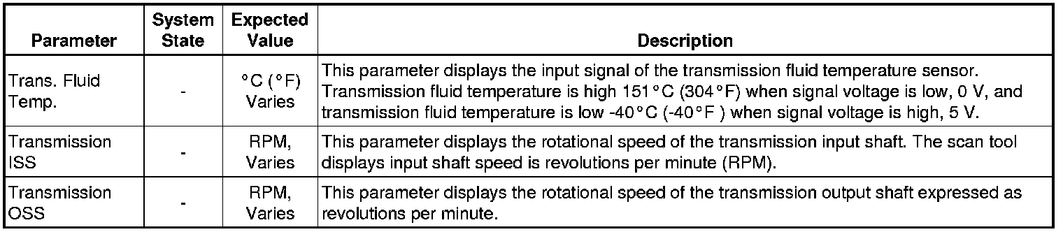 The Transmission Control Module Scan Tool Data List contains all transmission related parameters that are available on the scan tool. The list is arranged in alphabetical order. A given parameter may appear in any one of the data lists, and in some cases may appear more than once, or in more than one data list in order to group certain related parameters together.