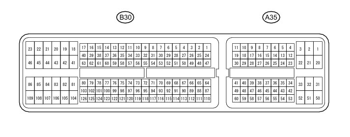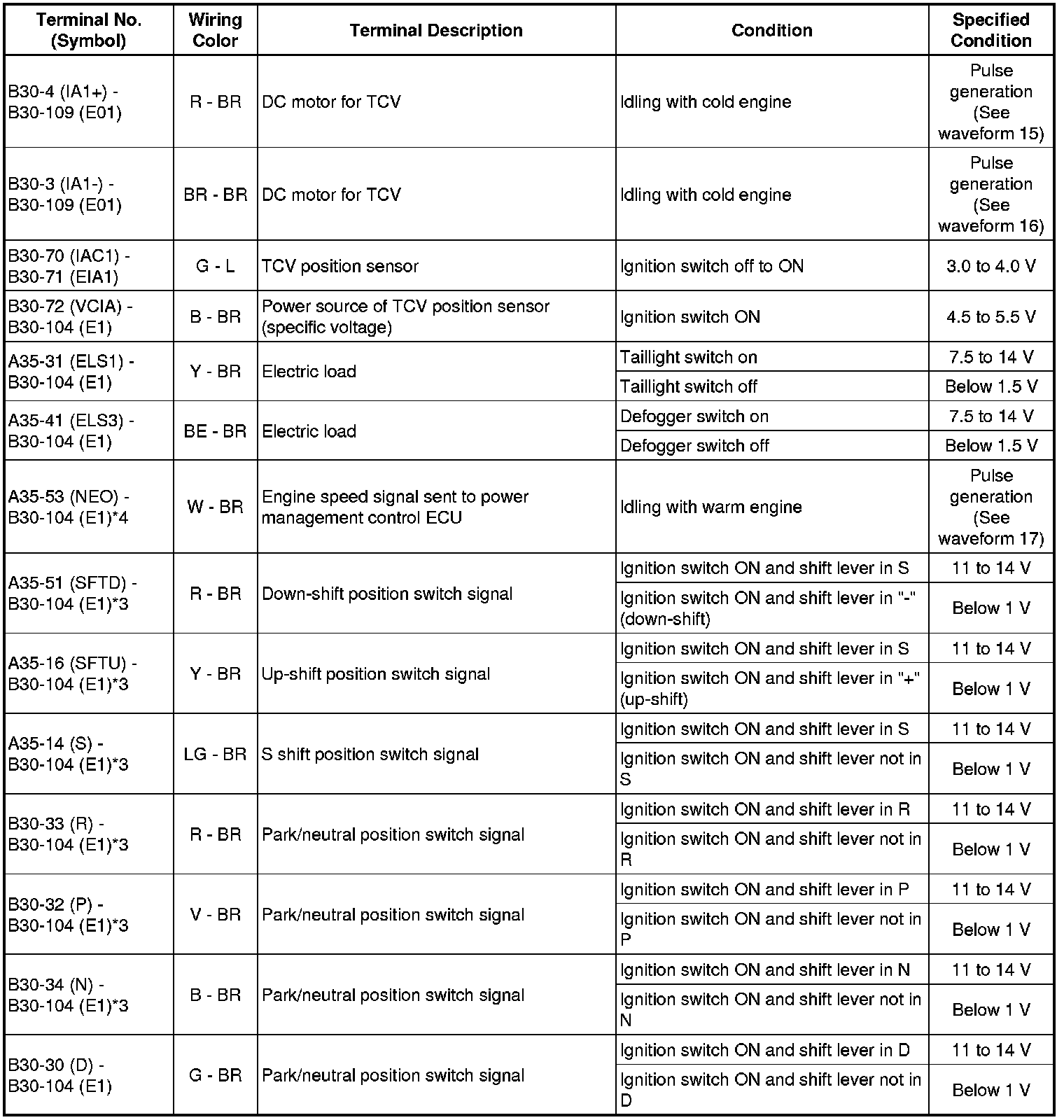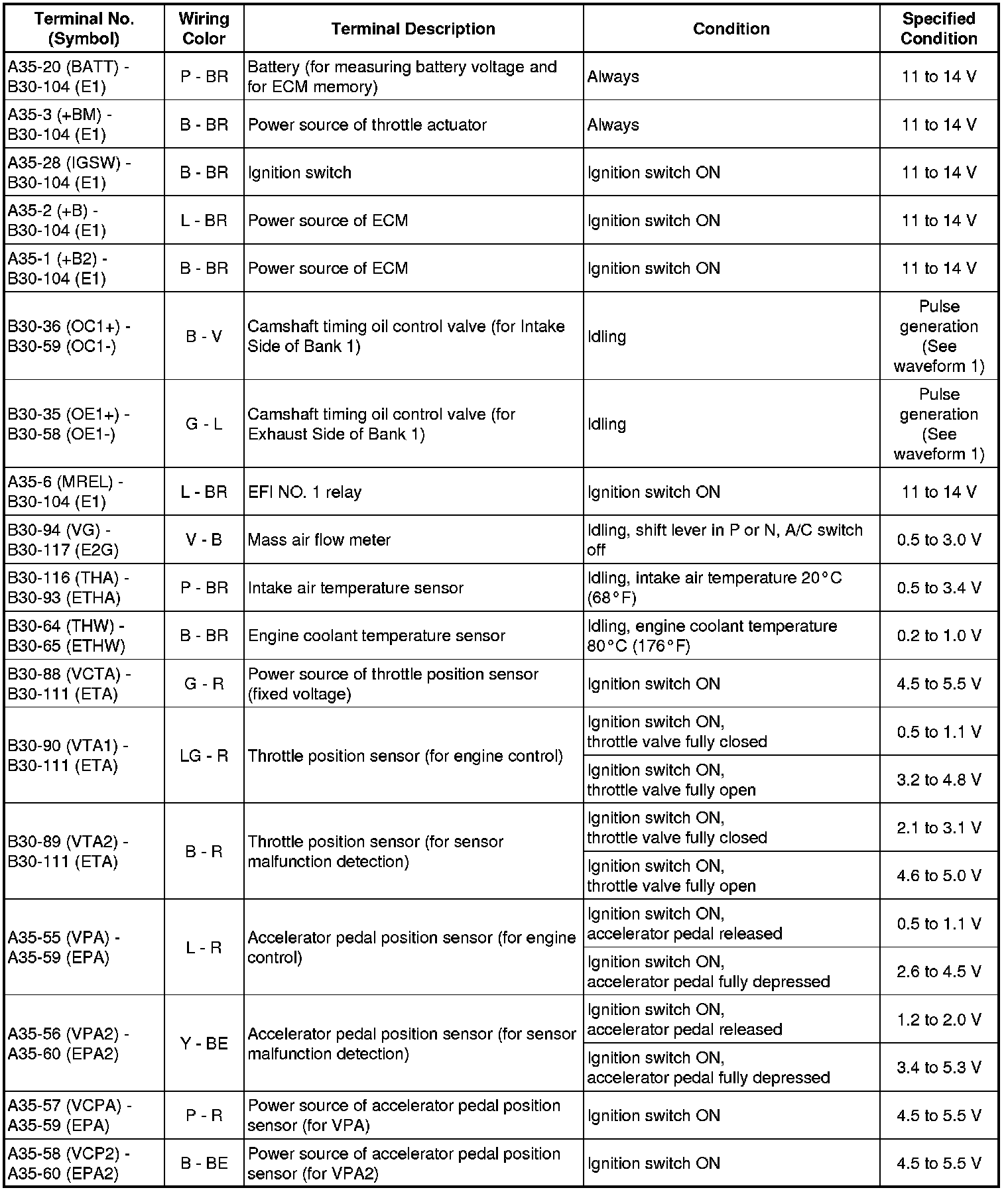 The standard voltage between each pair of ECM terminals is shown in the table below. The appropriate conditions for checking each pair of terminals are also indicated. The result of checks should be compared with the standard voltage for that pair of terminals, displayed in the "Specified Condition" column. The illustration above can be used as a reference to identify the ECM terminal locations.