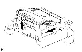 (d) Raise the multiplex network body ECU as shown by arrow (1), and then pull it out as shown by arrow (2) in the illustration.