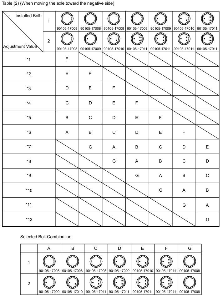 Check the combination of installed bolts. Select appropriate bolts from the table below to adjust the camber to the specified values.