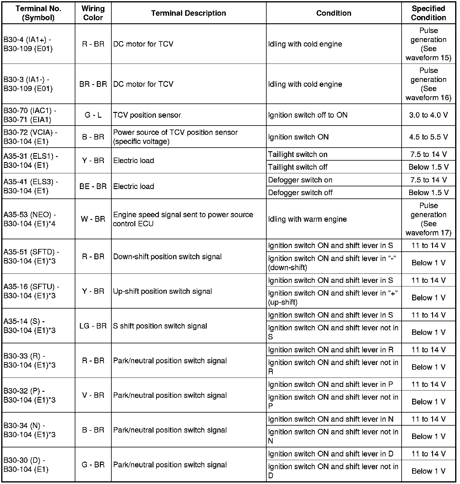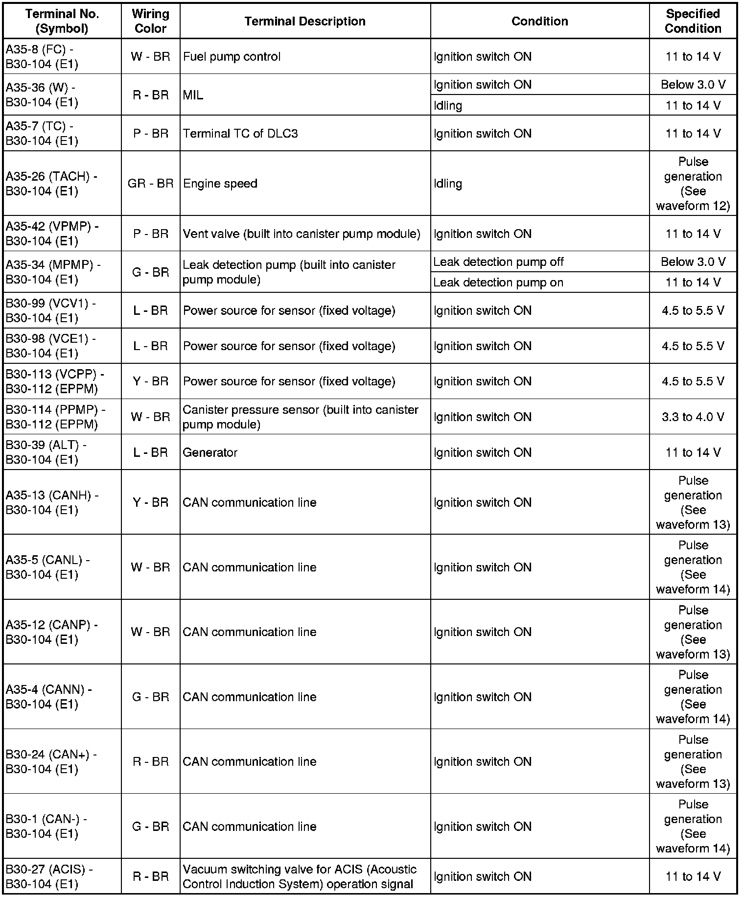 The standard voltage between each pair of ECM terminals is shown in the table below. The appropriate conditions for checking each pair of terminals are also indicated. The result of checks should be compared with the standard voltage for that pair of terminals, displayed in the "Specified Condition" column. The illustration above can be used as a reference to identify the ECM terminal locations.