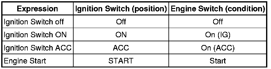 The type of ignition switch used on this model differs according to the specifications of the vehicle. The expressions listed in the table below are used in this section.