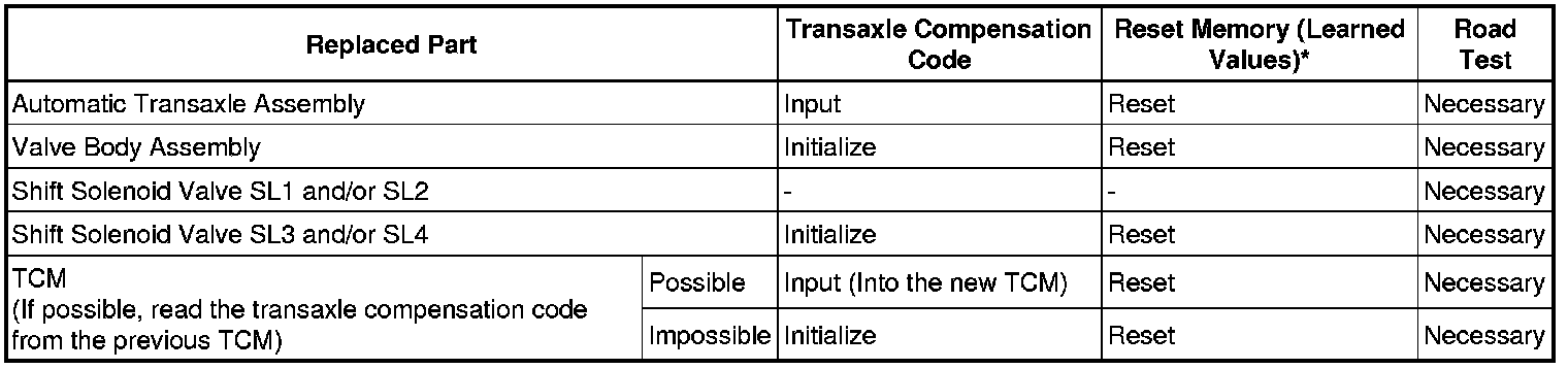 If automatic transaxle parts are replaced, perform the following as necessary referring to the table below.