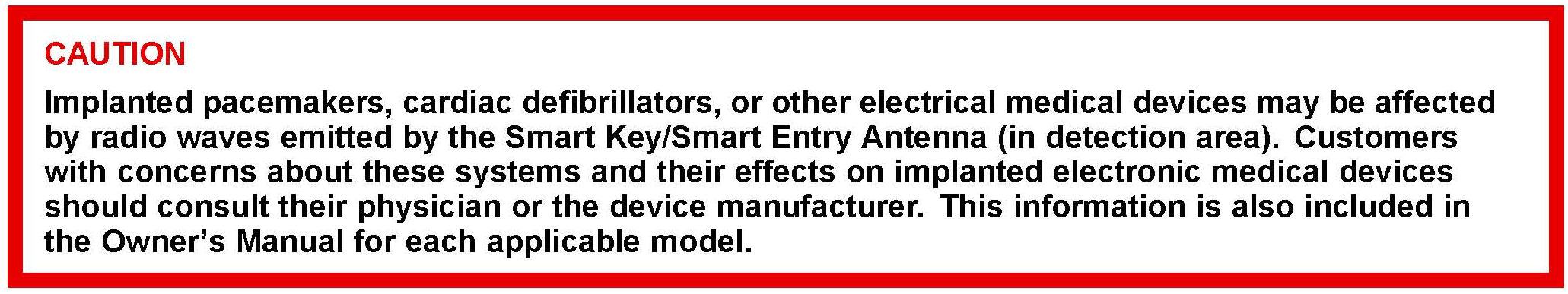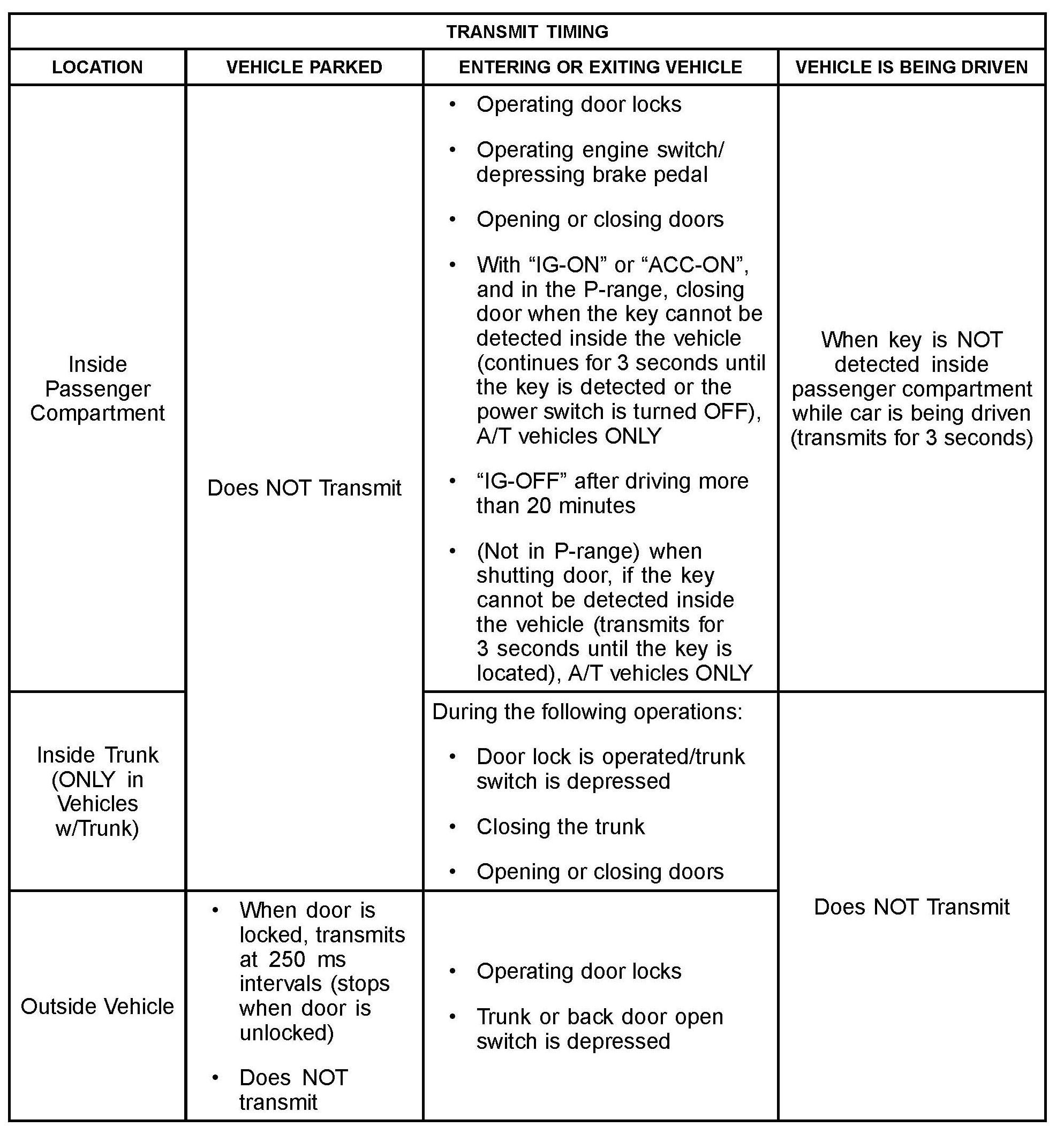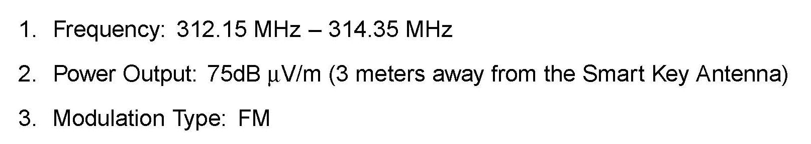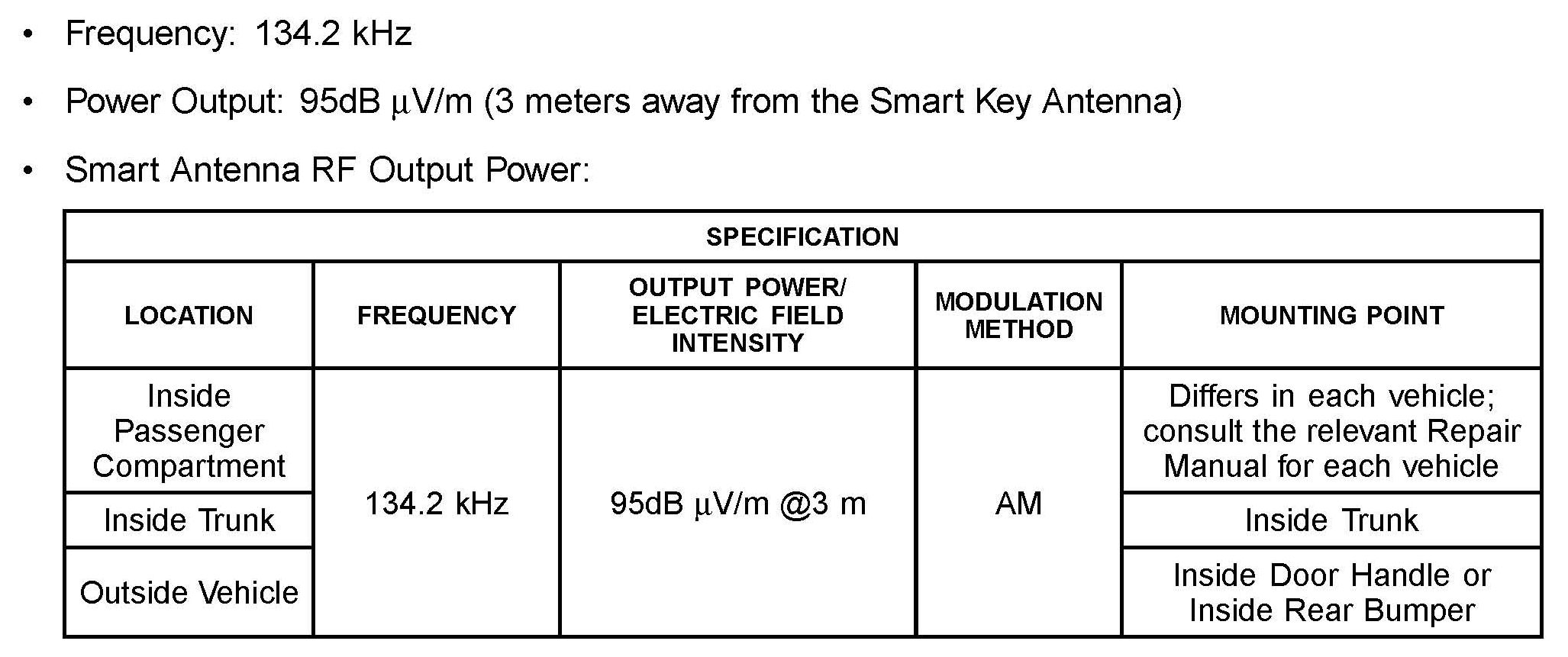 Some customers may inquire about the frequency and power output of the Smart Key/Smart Entry systems used on various models. The Smart Key/Smart Entry systems conform to all applicable FCC rules. This bulletin details the applicable specifications for these systems.