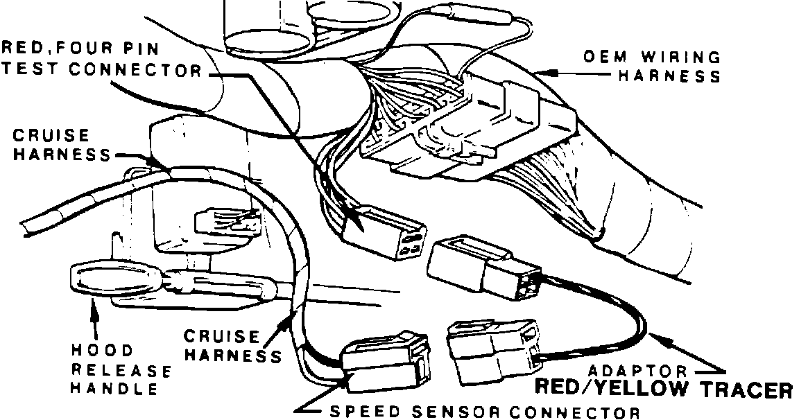 On all 1984 GL FWD models equipped with an Electronic Control Module (ECM), the in-dash speed sensor connector normally used for the cruise control hook up is connected to the Electronic Control Module (ECM). When installing SOA Cruise Control kits SOA 460 450 and SOA 460 550, an adapter wire is available to connect the cruise harness speed sensor connector to the red, four pin test connector, located behind the fuse box. (See figure 1).