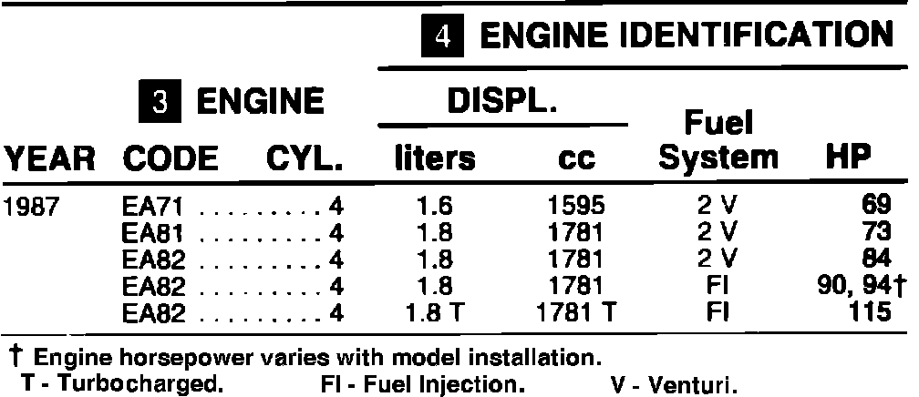 Home >> Subaru >> 1987 >> Brat F4-1781cc 1.8L >> Repair and Diagnosis >> Powertrain Management >> Application and ID >> Engine Code Identification