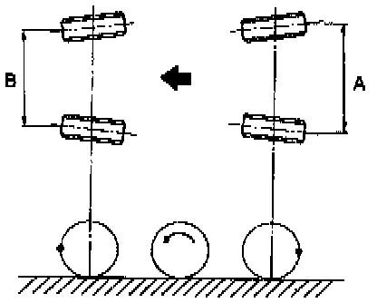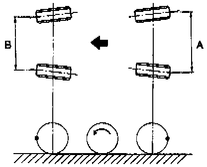 b. Mark rear sides of left and right tires at height corresponding to center of spindles and measure distance "B" between marks.