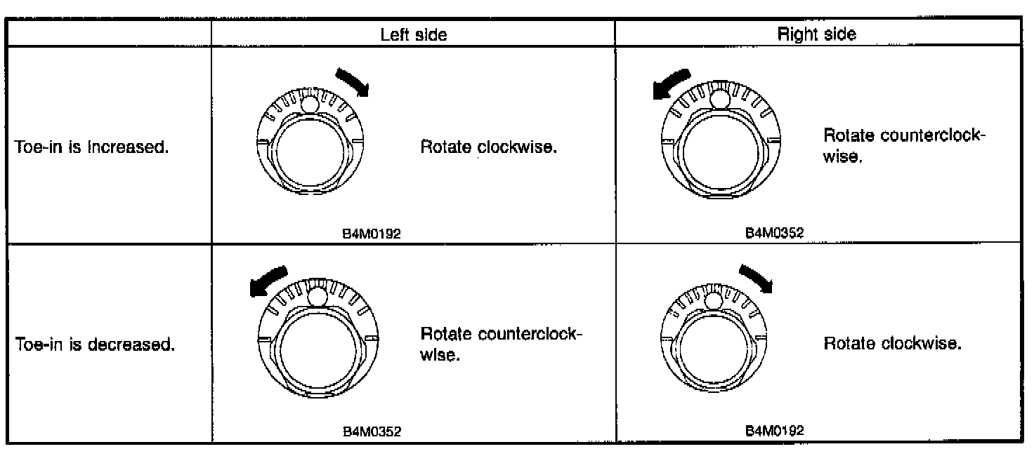 b. When one rear wheel is adjusted in a toe-in direction, adjust the other rear wheel equally in toe-out direction, in order to make thrust angle adjustment.