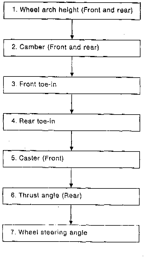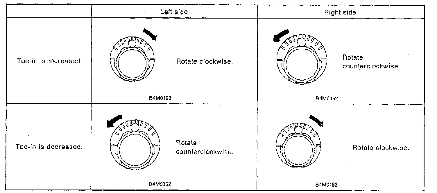 - When one rear wheel is adjusted in a toe-in direction, adjust the other rear wheel equally in toe-out direction in order to make thrust angle adjustment.