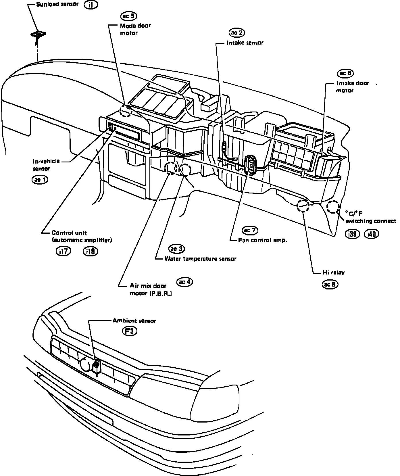 The fan control amplifier is located on the cooling unit. It amplifies a 12-step base current flowing from the auto amplifier to change blower speed.