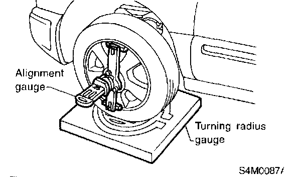 1. Place front wheel on turning radius gauge. Make sure ground contacting surfaces of front and rear wheels are set at the same height.