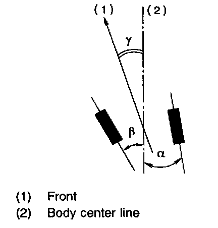 NOTE: Thrust angle refers to a mean value of left and right rear wheel toe angles in relation to vehicle body center line. Vehicle is driven straight in the thrust angle direction while swinging in the oblique direction depending on the degree of the mean thrust angle.