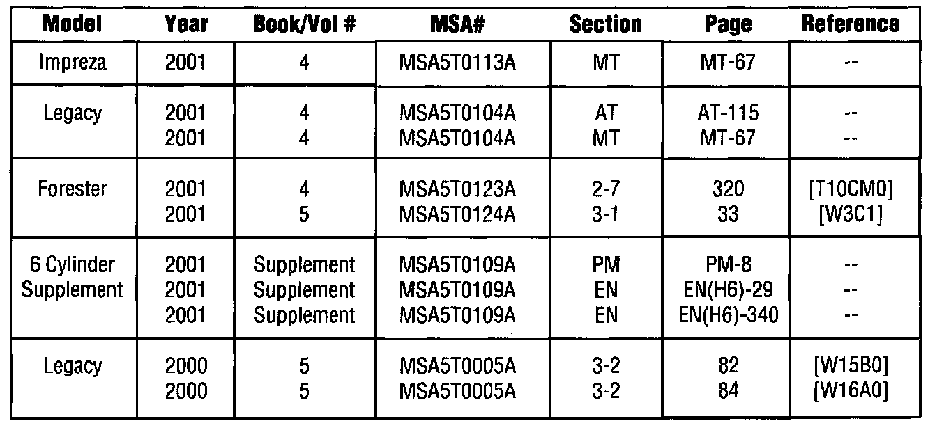Home >> Subaru >> 2001 >> Forester L F4-2.5L SOHC >> Repair and Diagnosis >> Powertrain Management >> Computers and Control Systems >> Relays and Modules - Computers and Control Systems >> Engine Control Module >> Technical Service Bulletins >> Service Manual Updates - Multiple Systems