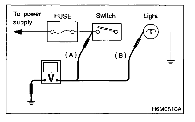 1. Using a voltmeter, connect the negative lead to a good ground point or negative battery terminal and the positive lead to the connector or component terminal.