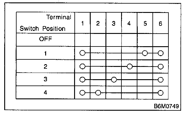3. Symbol "in the figure" indicates that continuity exists between two points or terminals. For example, when a switch position is "3", continuity exists among terminals 1, 3 and 6, as shown in table.