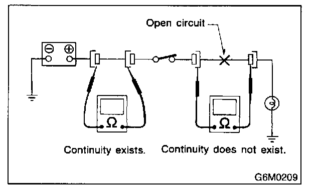Disconnect all connectors affected, and check continuity in the wiring between adjacent connectors. When the ohmmeter indicates "infinite", the wiring is open.