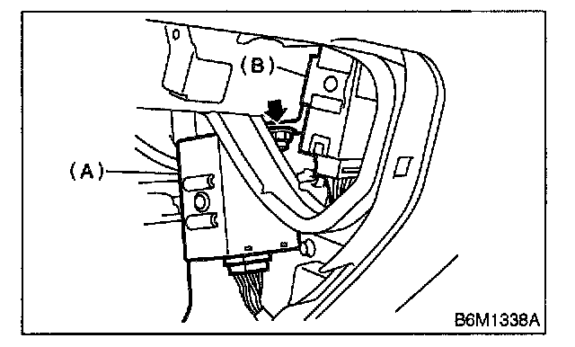 3. Remove nut, then remove keyless entry control module (B) and the other electrical control module (A) while disconnecting connector.