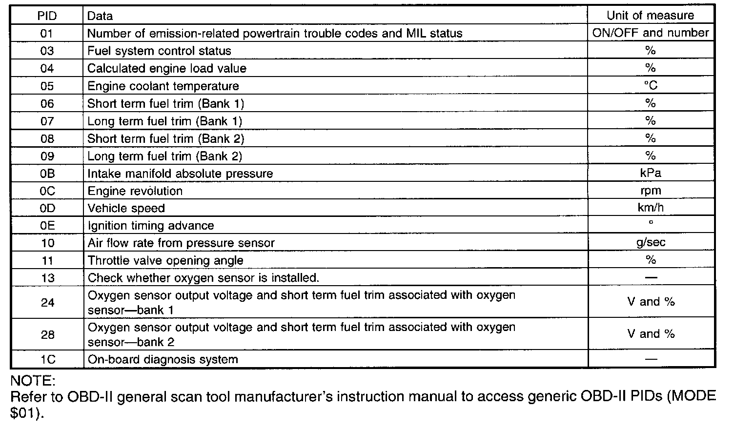 A list of the support data and PID (Parameter Identification) codes are shown in the above table.