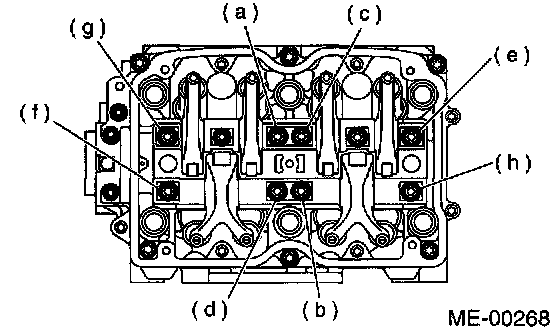 4) Tighten bolts (a) through (h) in alphabetical sequence 25 Nm (2.5 kgf-m, 18.1 ft. lbs.)