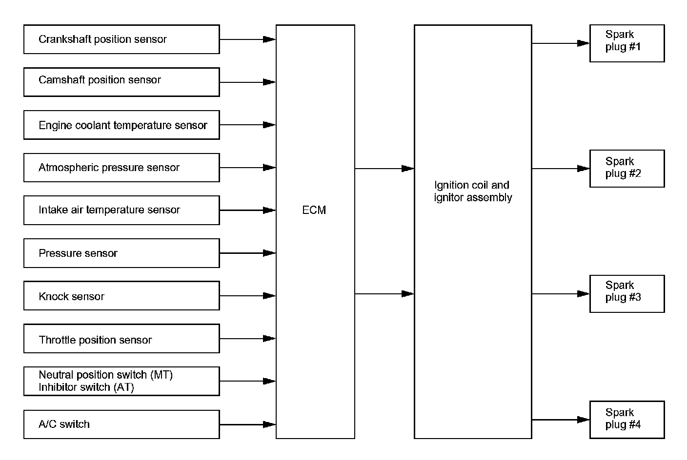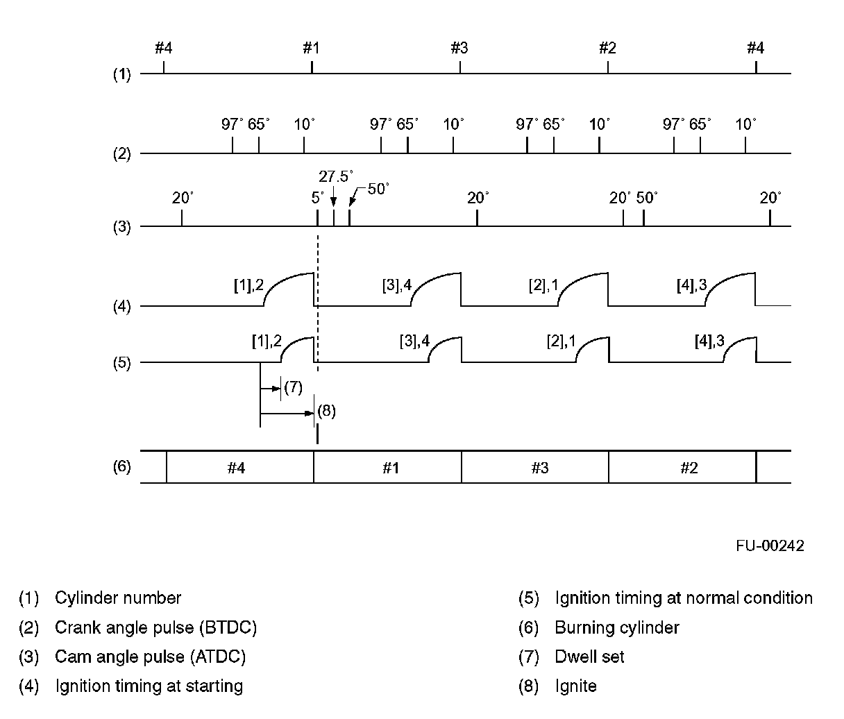 - Ignition control during start-up Engine speed fluctuates during start of the engine, so the ECM cannot control the ignition timing. During that period, the ignition timing is fixed at 10 ° BTDC by using the 10 ° signal from the crankshaft position sensor.