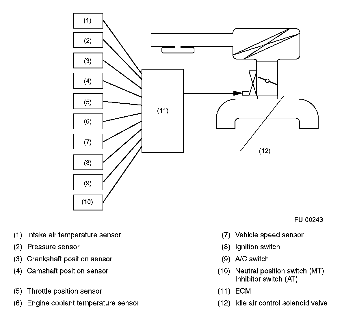 - The ECM activates the idle air control solenoid valve to control the bypass air flowing through the bypass passage in the throttle body depending on signals from the crankshaft position sensor, engine coolant temperature sensor, pressure sensor and A/C switch so that the proper idle speed for each engine load is achieved.