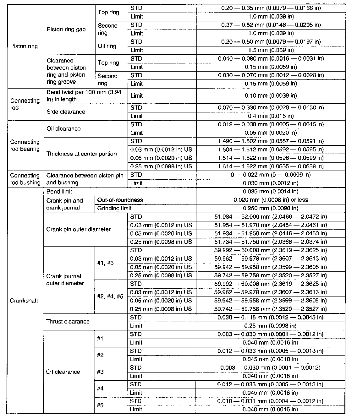 SPECIFICATIONSNote: STD: Standard I.D.: Inner Diameter O.D.: Outer Diameter US: Undersize OS: Oversize