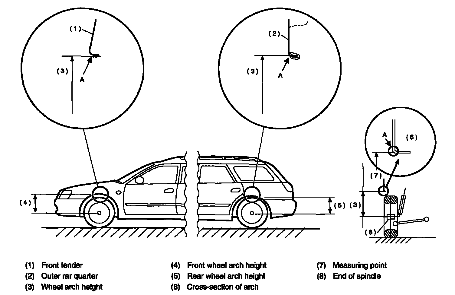 2. Mark rear sides of left and right tires at height corresponding to center of spindles and measure distance"A" between marks.
