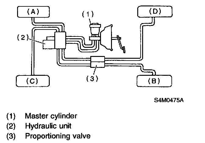 CAUTION: Brake fluid replacement sequence; (A) Front right -> (B) Rear left -> (C) Front left -> (D) Rear right
