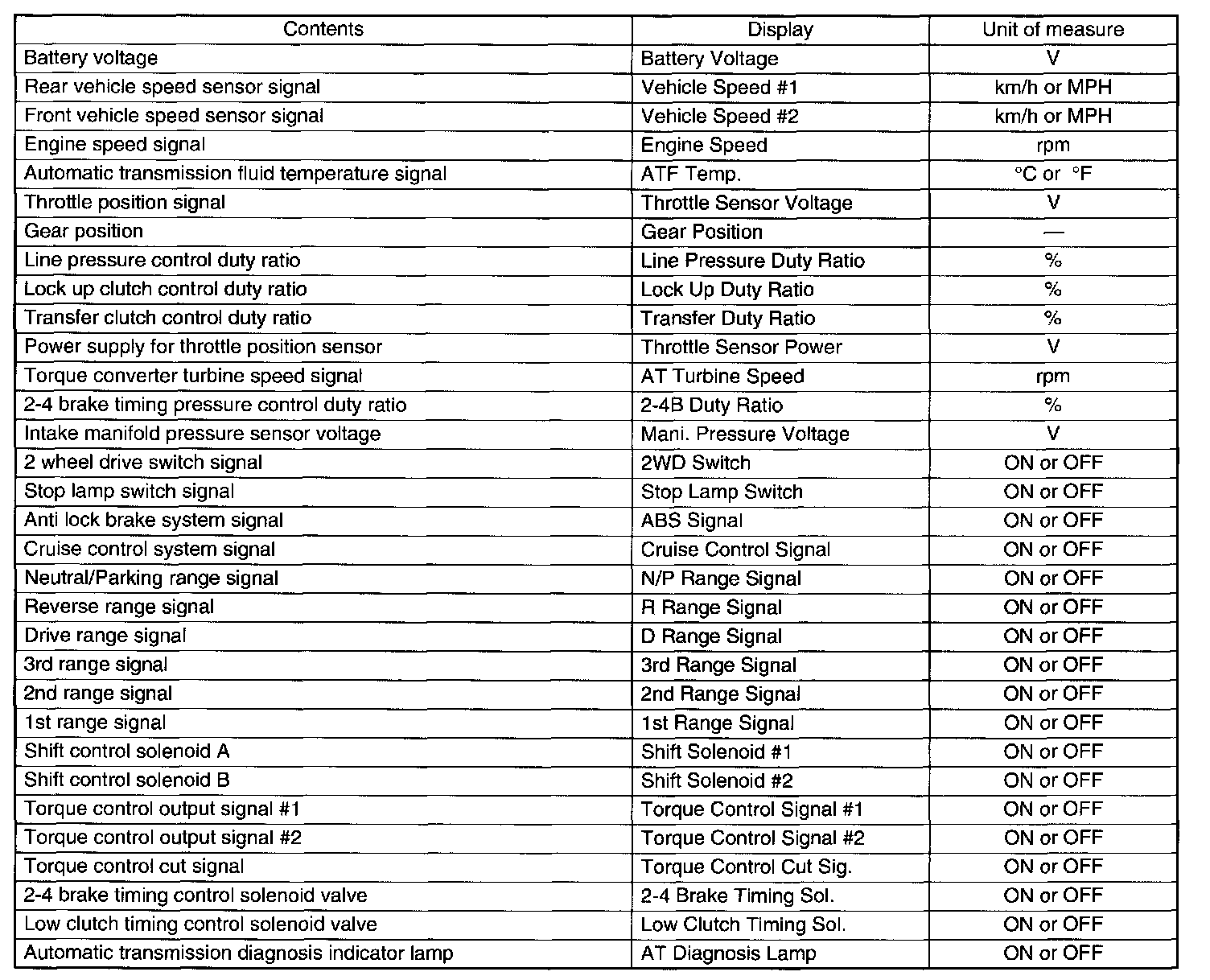 When the 2-4 brake timing solenoid is ON, ON is displayed. When OFF, OFF is displayed. The 2-4 brake timing solenoid is regulated by the TCM, controlling the release timing of the 2-4 brake.