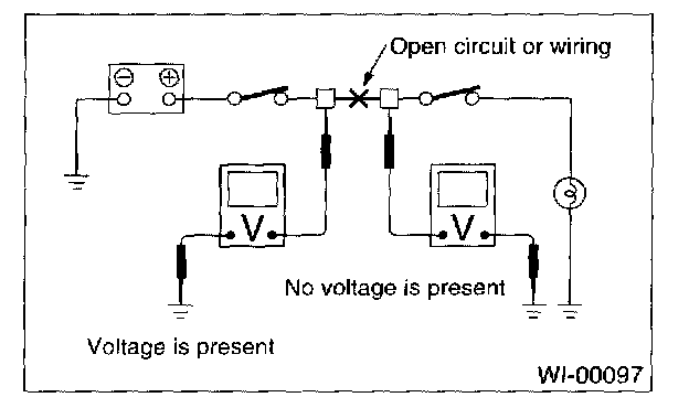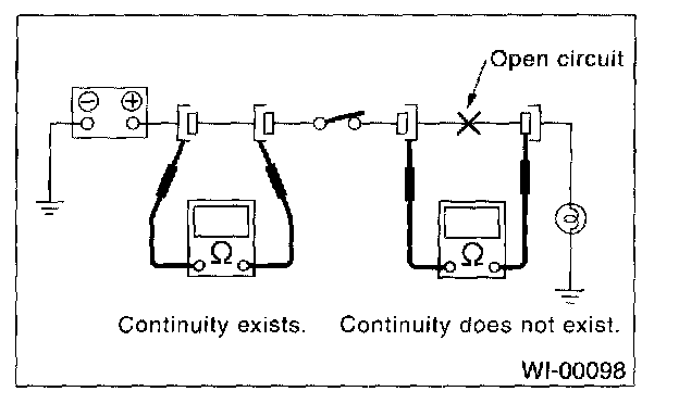 Disconnect all connectors affected, and check continuity in the wiring between adjacent connectors. When the ohmmeter indicates "infinite", the wiring is open.