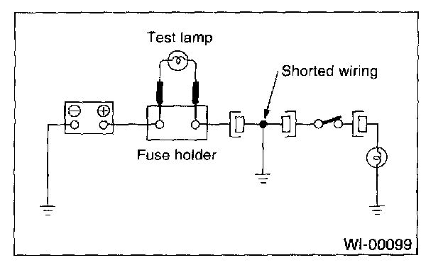 Connect a test lamp (rated at approximately 3 watts) in place of the blown fuse and allow current to flow through the circuit. Disconnect one connector at a time from the circuit, starting with the one located farthest from the power supply. If the test lamp goes out when a connector is disconnected, the wiring between that connection and the next connector (farther from the power supply) is shorted.