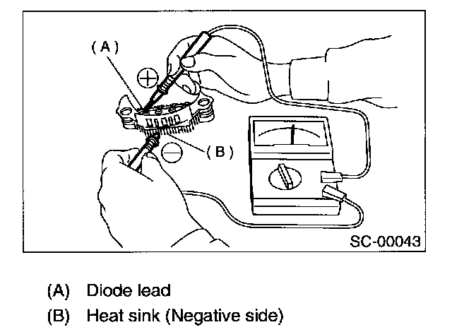 Check for continuity between the diode lead and positive side heat sink. The positive diode is in good condition if resistance is 1 Ohm or less only in the direction from the diode lead to heat sink.