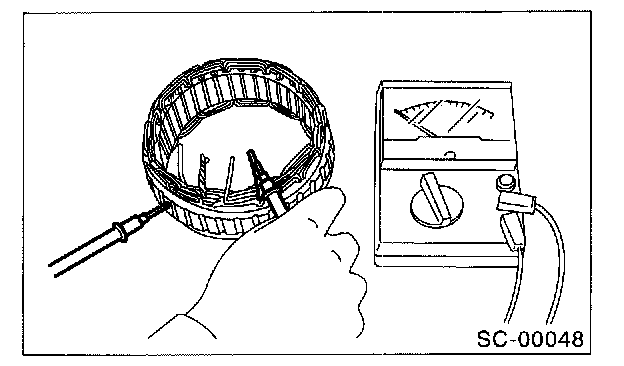 Inspect the stator coil for continuity between stator core and each end of lead wire. If resistance is 1 Ohm or less, the stator coil is grounded, and so replace the stator assembly.